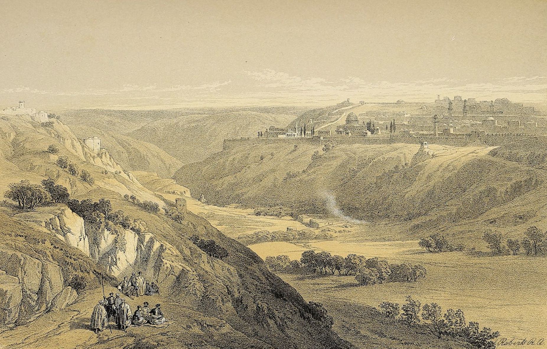 Lithographie d’après un dessin de David Roberts montrant la ville sainte dans une vue panoramique depuis les collines environnantes.