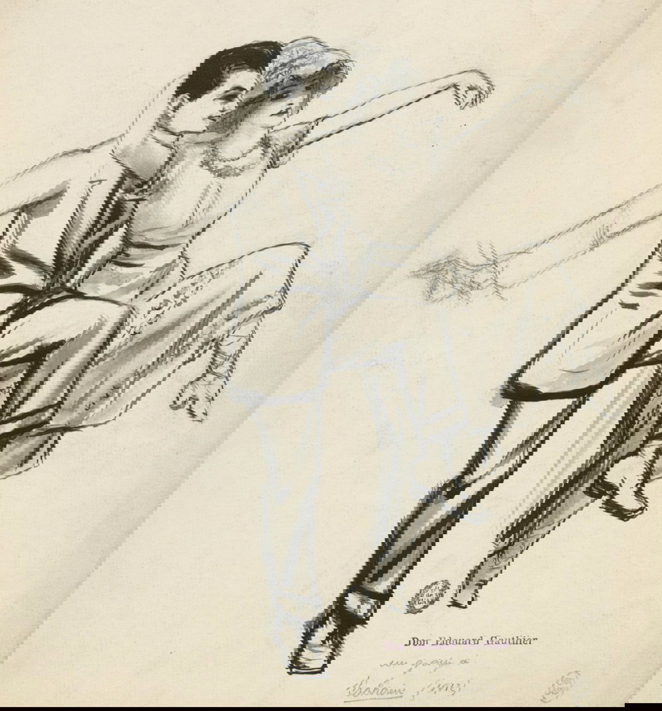 Au début du 20ᵉ siècle, le Bal Tabarin, à Montmartre, est l’un des hauts lieux de la vie nocturne parisienne. On y vient pour danser, mais aussi pour admirer les danseurs professionnels qui lancent les nouvelles modes chorégraphiques. Dans ce dessin, Paul Charles Delaroche saisit un couple en plein mouvement, dans une danse vive et élégante, typique de l’atmosphère festive des grands bals parisiens de la Belle Époque. Source : gallica.bnf.fr / BnF.