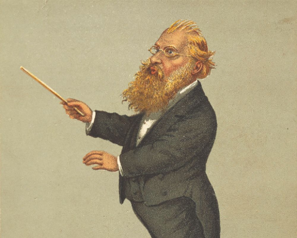 Chef d’orchestre, caricature musicale (fin du 19ᵉ siècle) Caricature humoristique représentant un chef d’orchestre dirigeant avec emphase. Ces figures pittoresques de la vie musicale, souvent croquées par les illustrateurs de la presse satirique, rappellent l’ambiance des répétitions d’opéra où se mêlent autorité du chef, discipline de l’orchestre et traditions du monde lyrique. Illustration satirique, fin du 19ᵉ siècle.