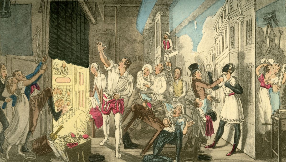 Gravure de coulisses théâtrales, attribuée à Theodore Lane, vers 1825, issue d’une série consacrée à la vie des acteurs (Life of an Actor).