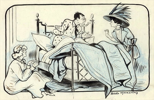 Armande Cassive, Marcel Simon et Suzanne Carlix dans Occupe-toi d’Amélie de Georges Feydeau, dessin de Yves Marevéry. Source : gallica.bnf.fr / BnF