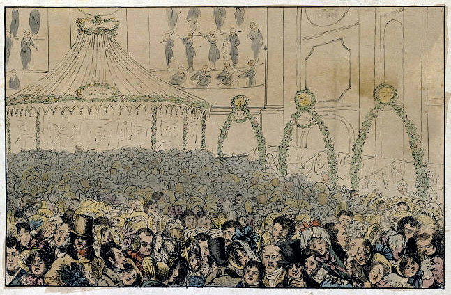 Gravure illustrant une salle animée, où l’enthousiasme du public participe au succès d’une pièce, parfois encouragé ou amplifié.