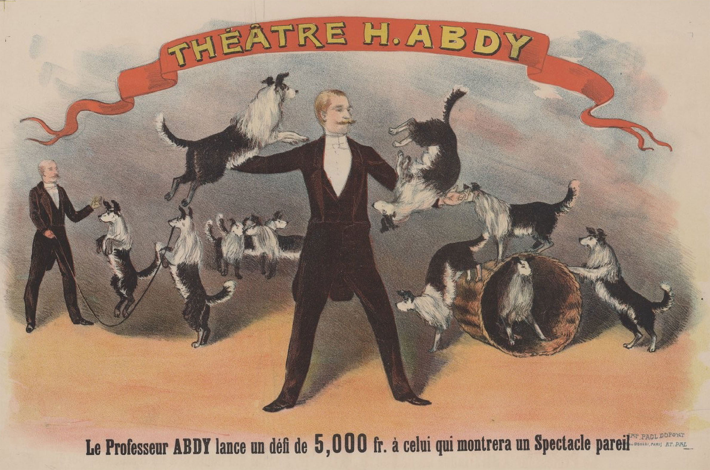 Théâtre H. Abdy : le professeur Abdy lance un défi de 5,000 fr. à celui qui montrera un spectacle pareil (chiens savants) Affiche non identifiée. 1897. Source gallica.bnf.fr / BnF