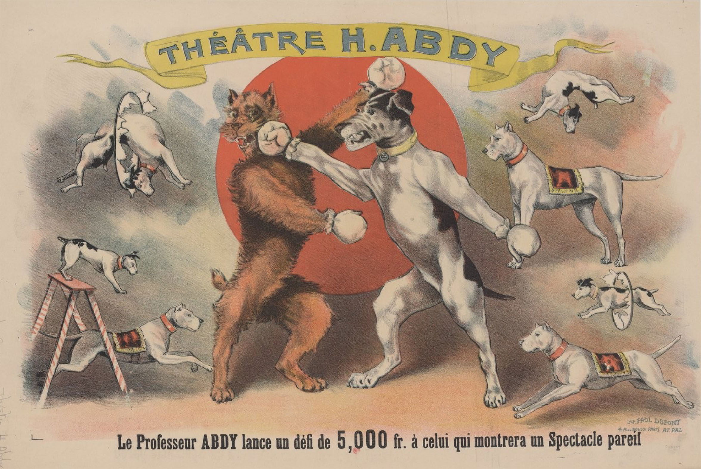 Théâtre H. Abdy : le professeur Abdy lance un défi de 5,000 fr. à celui qui montrera un spectacle pareil (chiens boxeurs). Affiche non identifiée. 1895. Source gallica.bnf.fr / BnF
