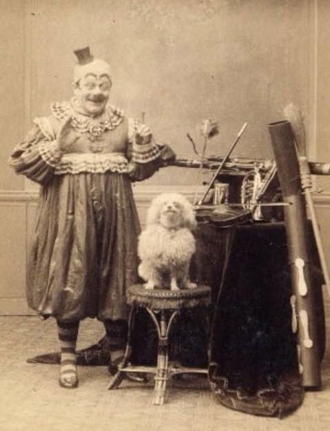 Photographie de studio ou de tournée représentant un clown de cirque accompagné de son chien savant, issue de la culture visuelle populaire de la fin du 19e et du début du 20e siècle. Ces images servaient à la fois de souvenirs de spectacle, de supports promotionnels et parfois de cartes postales. Ce type de duo clown–chien est alors très répandu dans les cirques itinérants, music-halls et cafés-concerts, où l’animal devient partenaire comique à part entière.