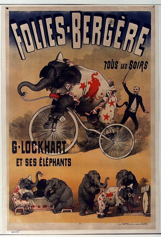 Affiche lithographiée en couleurs réalisée en 1890 à Paris, imprimée par F. Appel (21 rue Oberkampf), annonçant le numéro de G. Lockhart et ses éléphants aux Folies-Bergère.