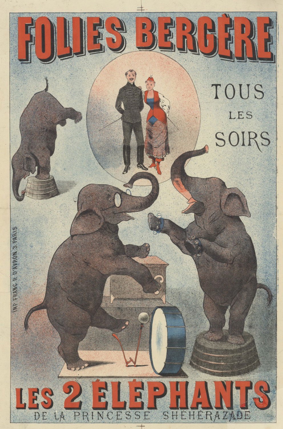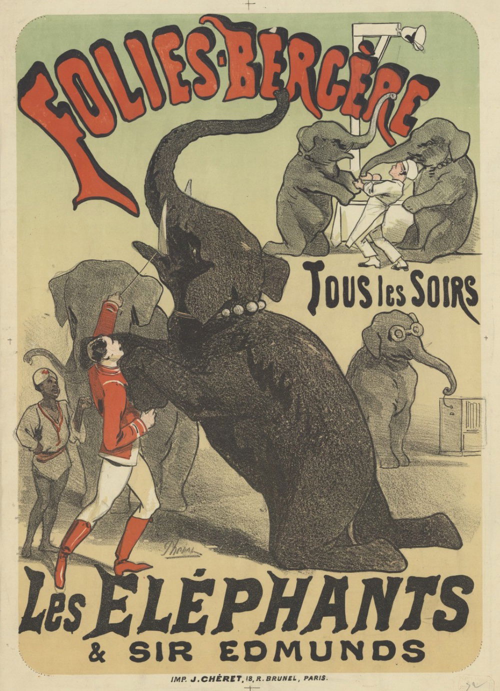 Chéret, Jules (1836-1932). Illustrateur. Folies-Bergère. Tous les soirs les éléphants & Sir Edmunds : Affiche Chéret. 1877. Source gallica.bnf.fr / BnF