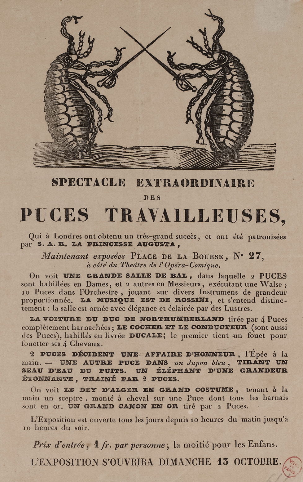Publicité pour le spectacle extraordinaire des puces travailleuses, 27 place de la Bourse. Anonyme , Imprimeur. Anonyme , Graveur. Musée Carnavalet.