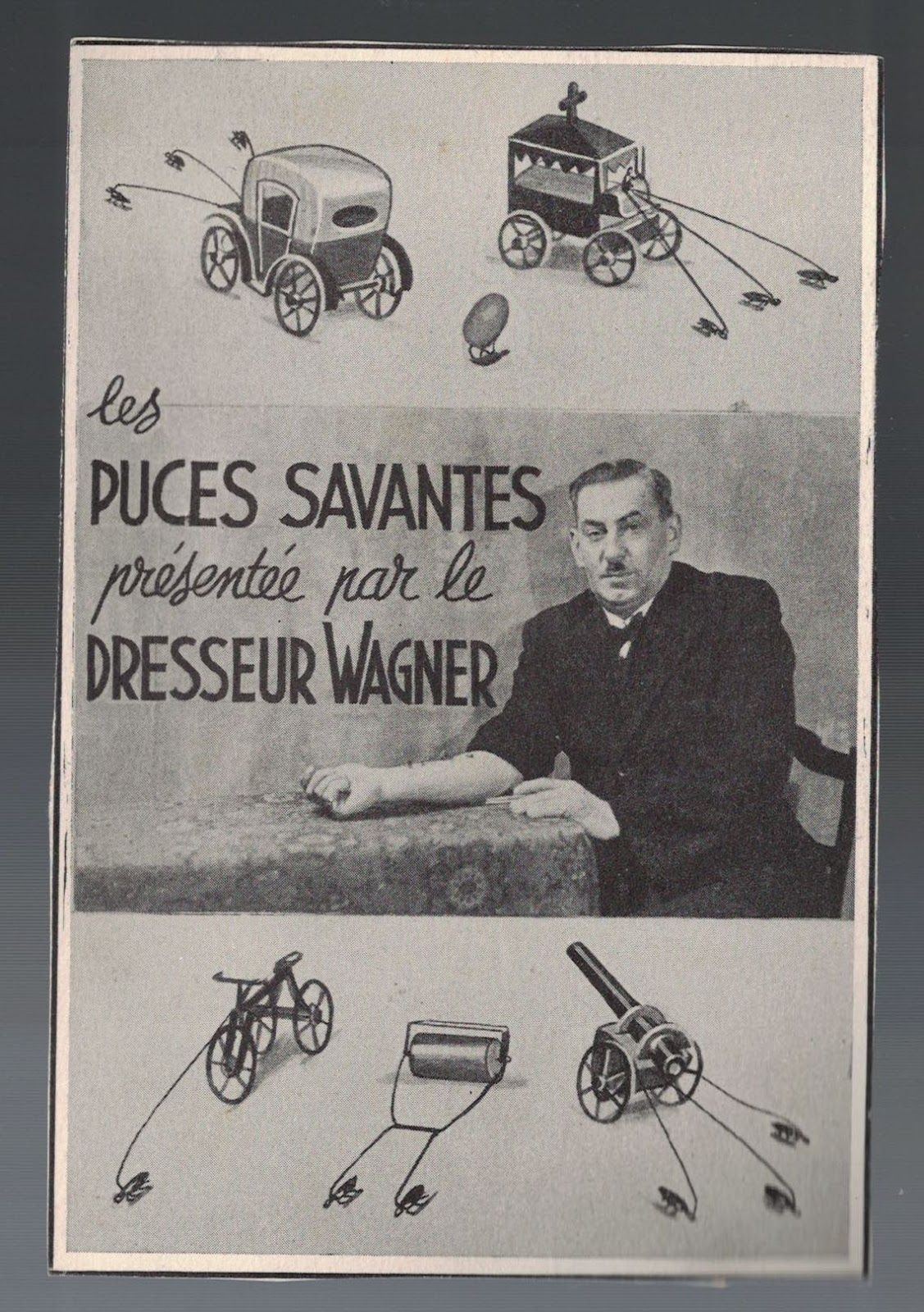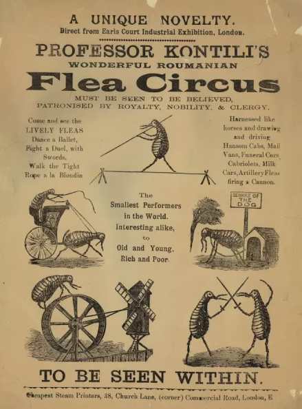 Cirque aux puces Vers 1900 : Publicité pour le merveilleux cirque roumain aux puces du professeur Kontilis, dans lequel les puces exécutent des ballets, se battent en duel, marchent sur la corde raide et tirent des carrosses.
