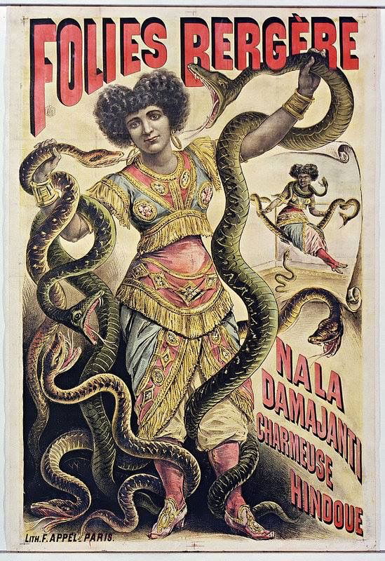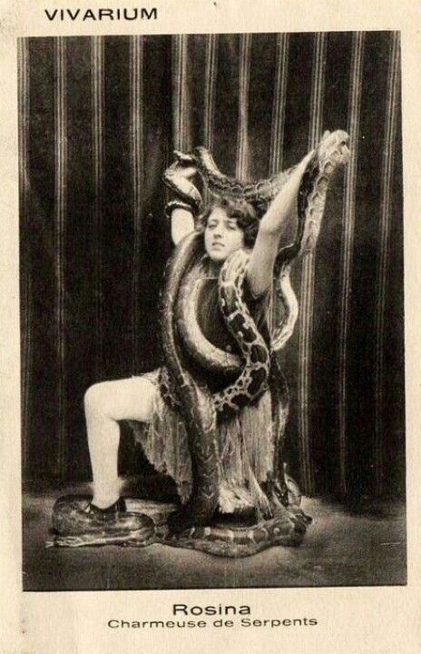 À la fin du 1800 et au début du 1900, les charmeurs et charmeuses de serpents occupent une place singulière dans les cirques et les music-halls. Très souvent, ce sont des femmes qui incarnent ces numéros, mêlant grâce, maîtrise du corps et fascination pour le danger.