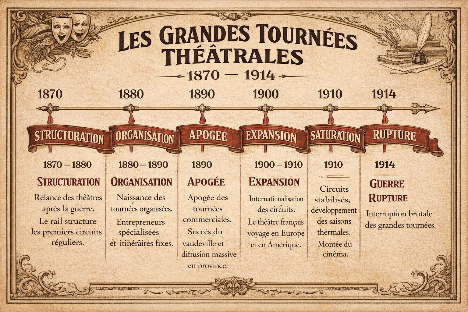 Entre 1850 et 1914, les tournées théâtrales auront ainsi relié la province à la capitale, exporté les succès parisiens, et donné au spectacle une dimension nationale. Le rideau ne se levait plus seulement sur une scène fixe : il voyageait. Et avec lui, tout un monde.