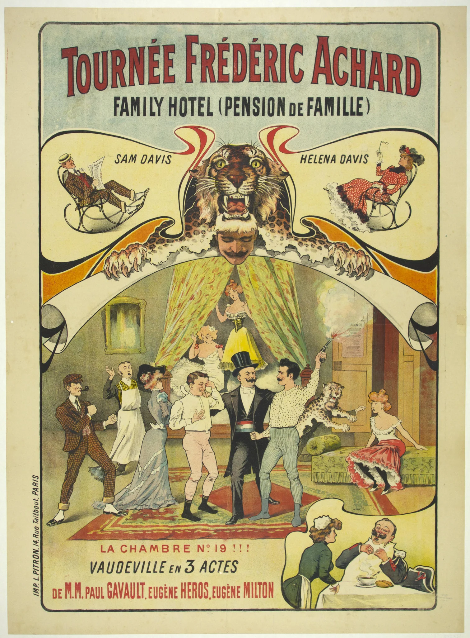 Vers 1900 : affiche de la Tournée Frédéric Achard annonçant le vaudeville La Chambre n°19 (Family Hotel – Pension de famille), imprimée à Paris par L. Pétron. Témoignage de l’âge d’or des tournées théâtrales de la Belle Époque.