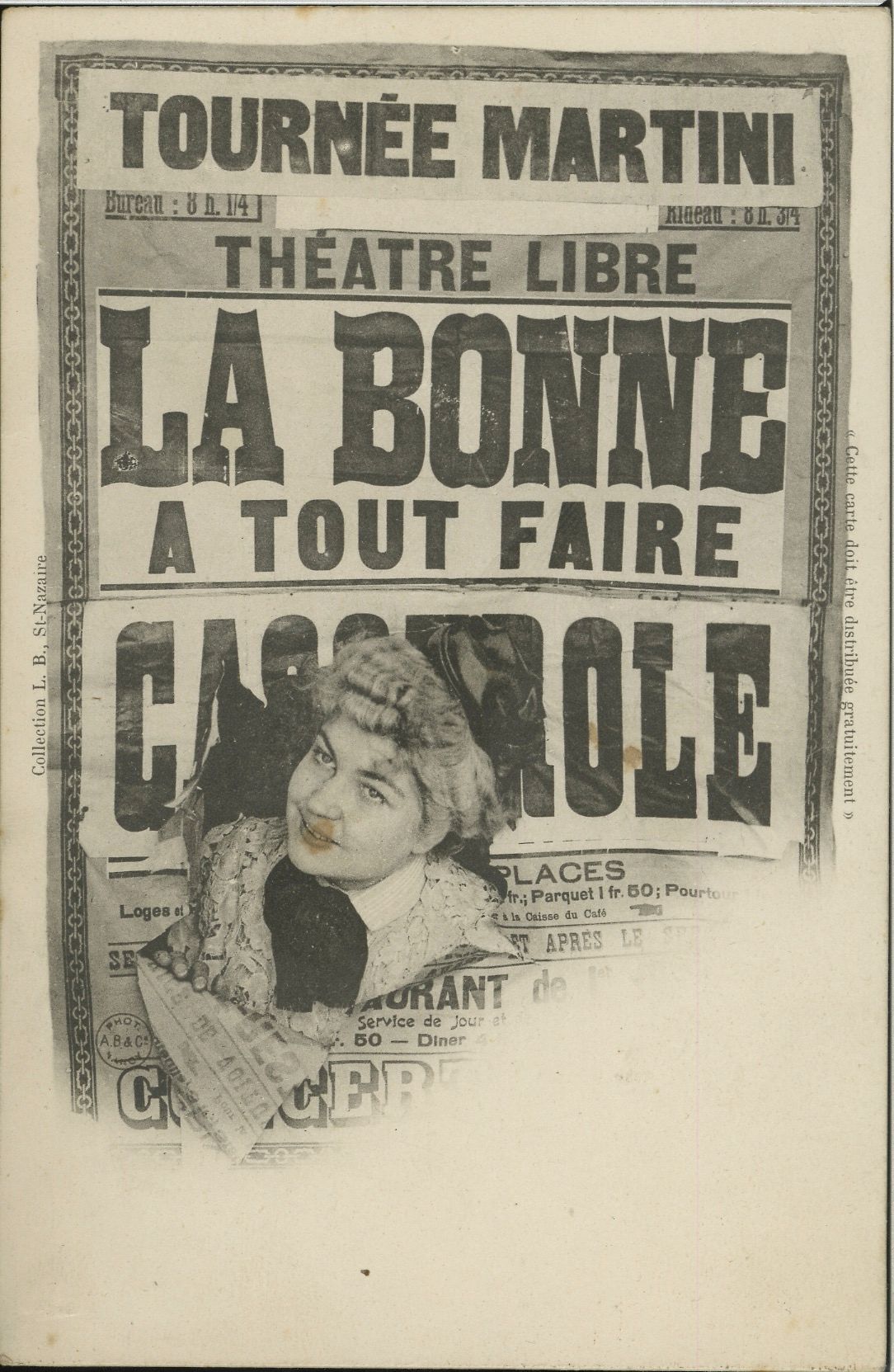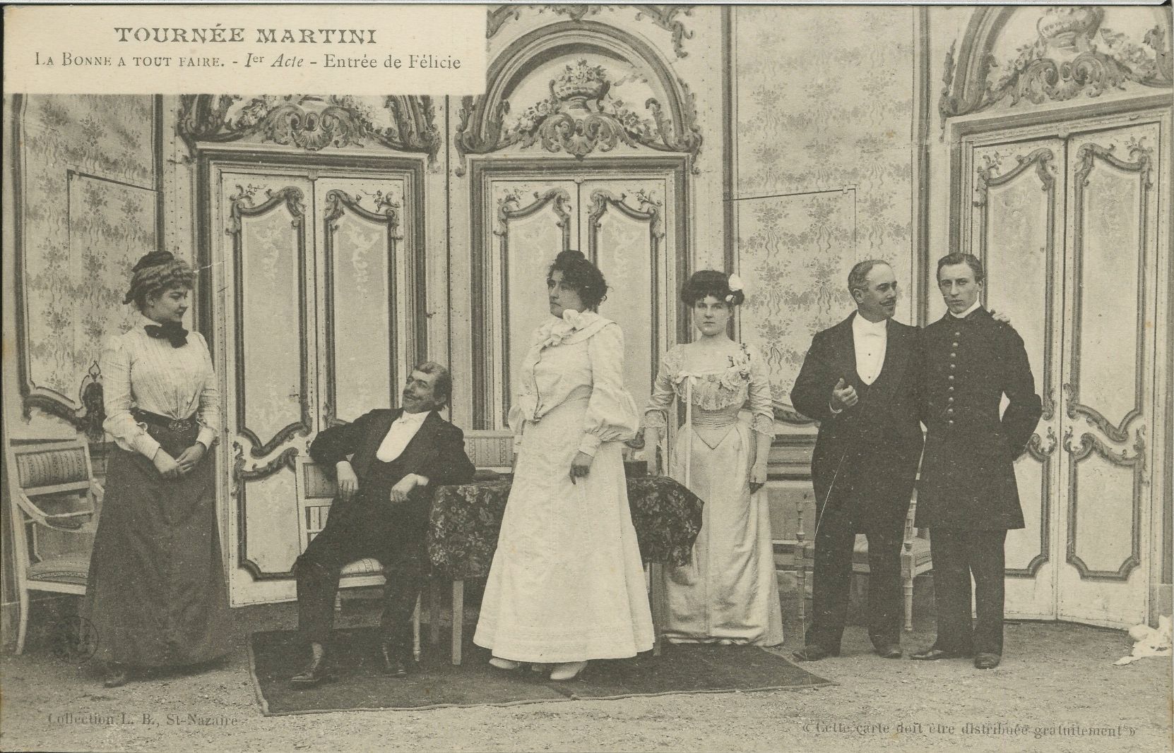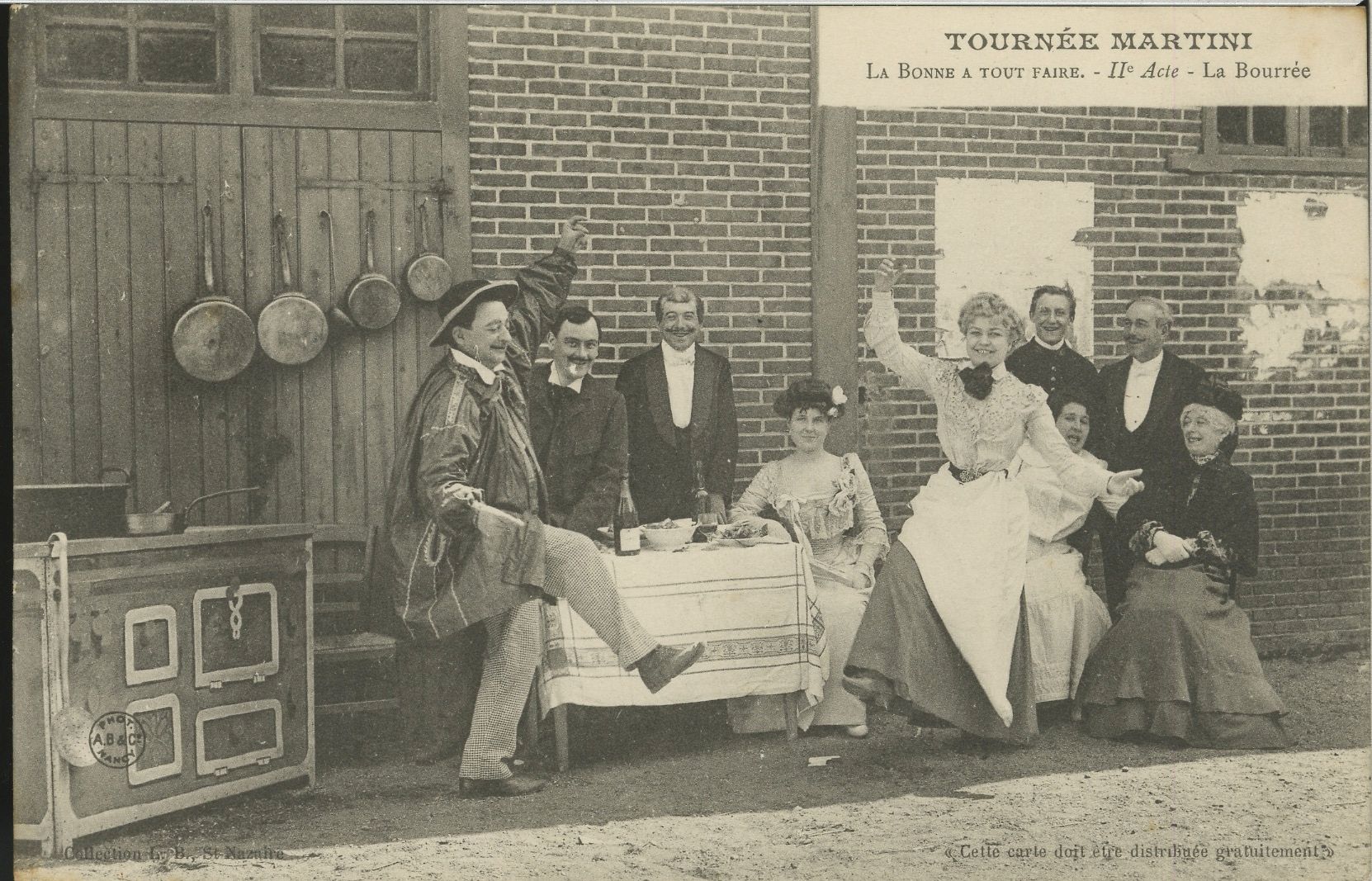 Vers 1895–1910 : la Tournée Martini apparaît régulièrement sur les affiches et cartes postales théâtrales diffusées en province. Martini n’est ni auteur ni comédien vedette : il est entrepreneur de tournées, c’est-à-dire organisateur et gestionnaire de spectacles itinérants. Son rôle est central. Il constitue la troupe, négocie avec les directeurs de théâtres municipaux, organise les déplacements, supervise l’impression des affiches et assure le partage des recettes. Son nom, imprimé en tête des programmes, sert de garantie professionnelle. Les pièces présentées — comme La Bonne à tout faire ou La Casserole — appartiennent au registre comique populaire. Elles sont choisies pour leur efficacité scénique et leur facilité de transport : décors démontables, distribution souple, succès déjà éprouvé.