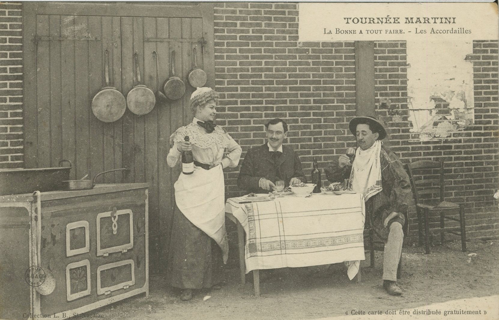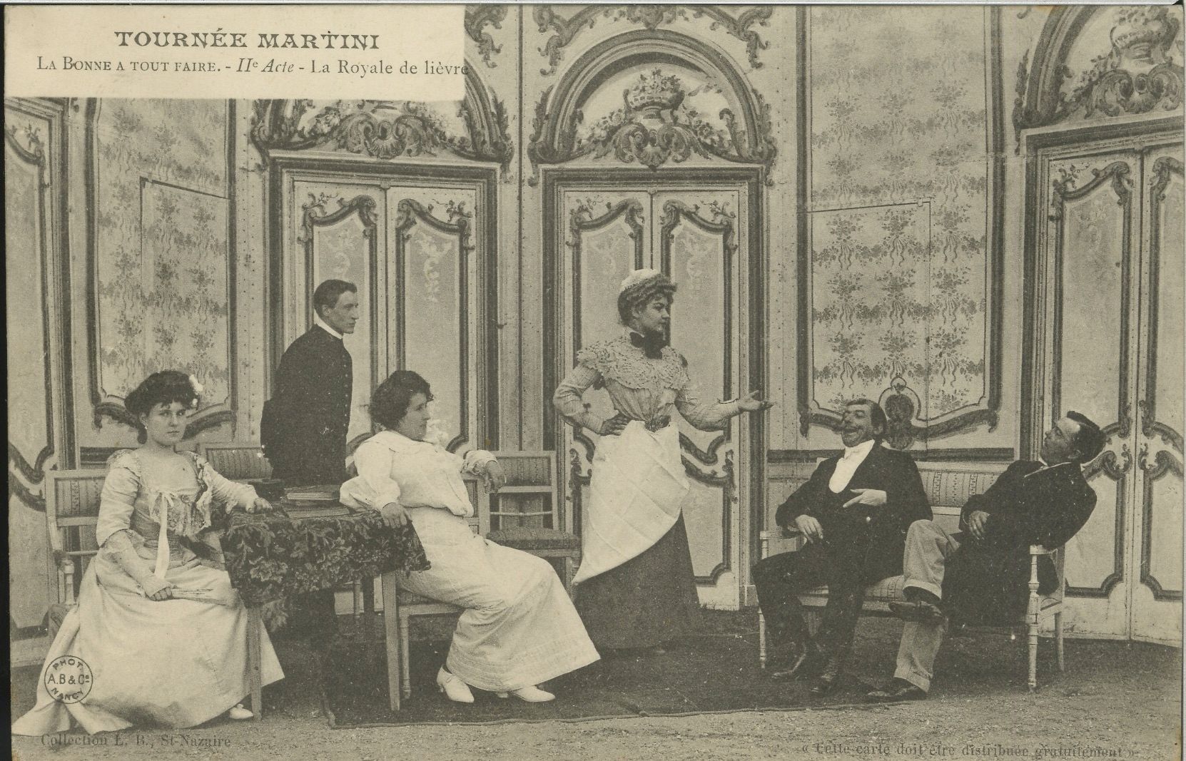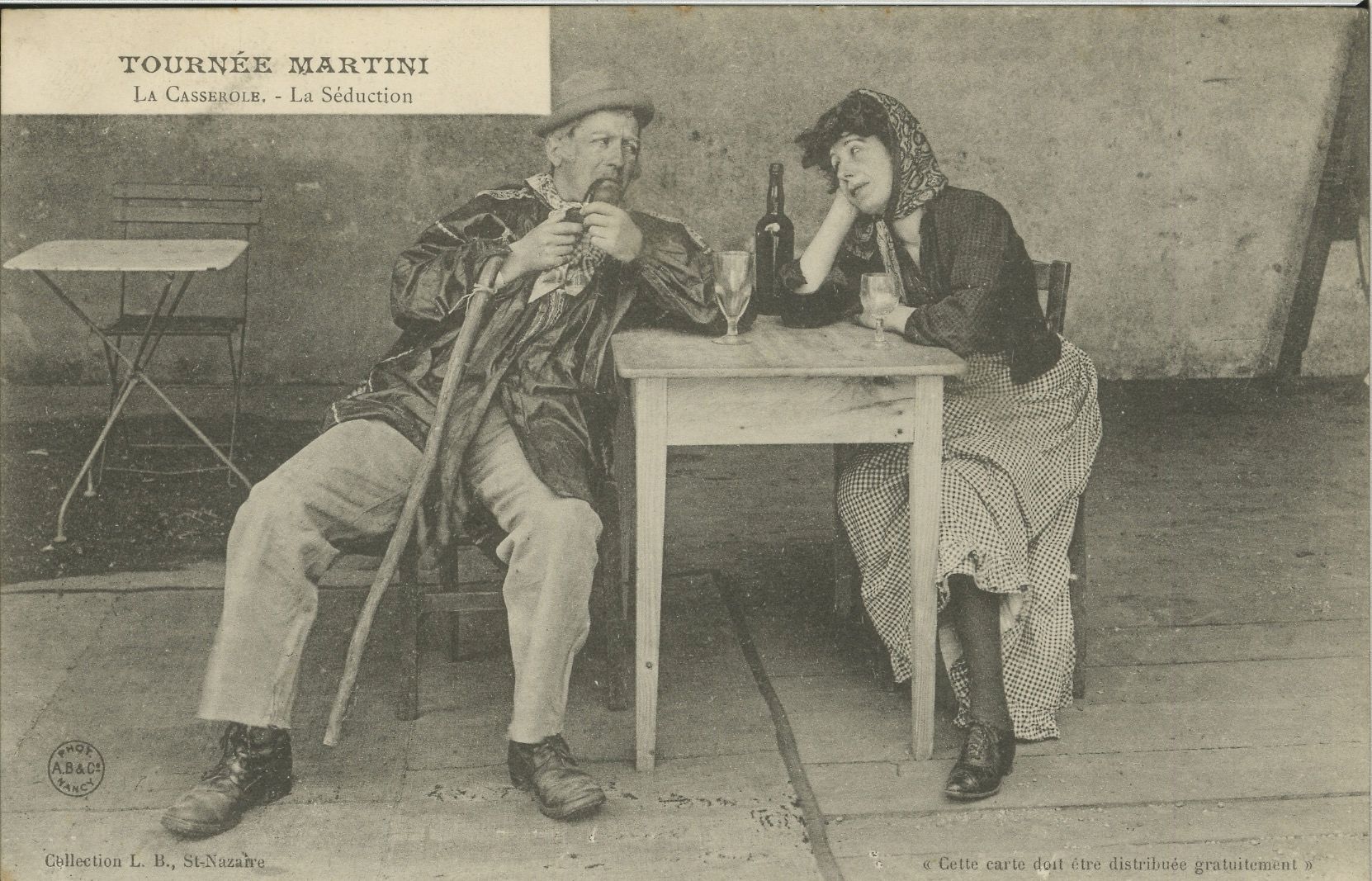Vers 1895–1910 : la Tournée Martini apparaît régulièrement sur les affiches et cartes postales théâtrales diffusées en province. Martini n’est ni auteur ni comédien vedette : il est entrepreneur de tournées, c’est-à-dire organisateur et gestionnaire de spectacles itinérants. Son rôle est central. Il constitue la troupe, négocie avec les directeurs de théâtres municipaux, organise les déplacements, supervise l’impression des affiches et assure le partage des recettes. Son nom, imprimé en tête des programmes, sert de garantie professionnelle. Les pièces présentées — comme La Bonne à tout faire ou La Casserole — appartiennent au registre comique populaire. Elles sont choisies pour leur efficacité scénique et leur facilité de transport : décors démontables, distribution souple, succès déjà éprouvé.