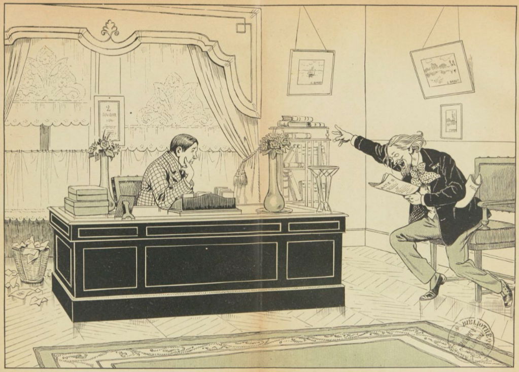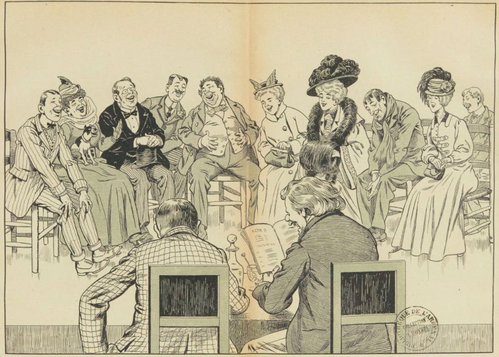 L’impresario reçoit la visite d’un auteur qui lui lit une pièce en 5 actes et 11 tableaux, avec prologue et apothéose.