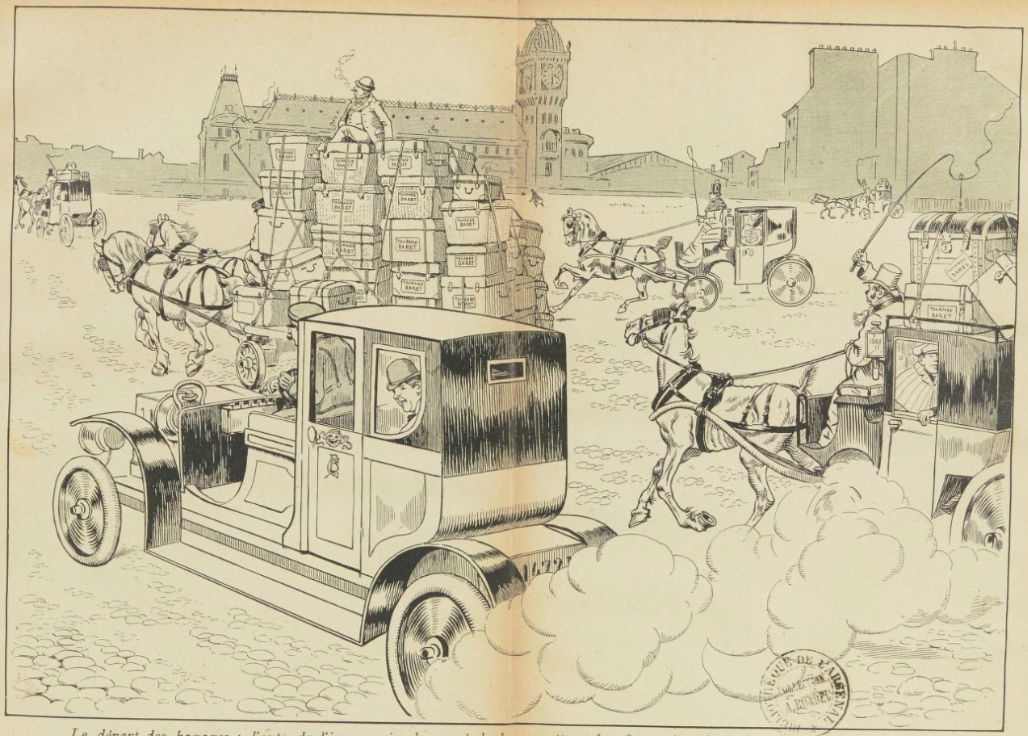 Le départ des bagages : l’auto de l’impresario, le coupé de la coquette et les fiacres à galerie des seigneurs sans importance.