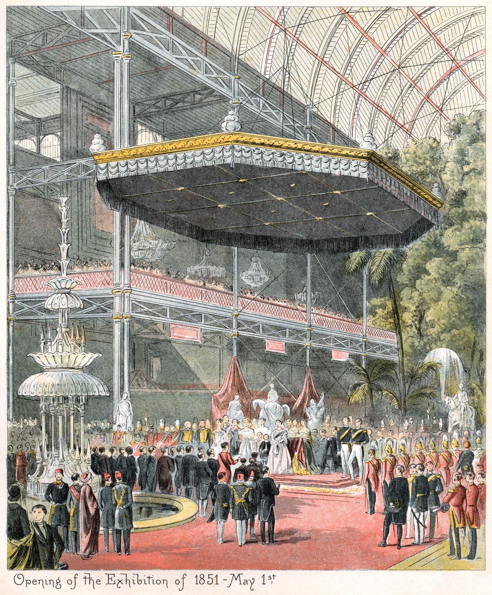 Ouverture de la Great Exhibition of the Works of Industry of All Nations au Crystal Palace de Hyde Park, à Londres, le 1 mai 1851, inaugurée par la reine Victoria et le prince Albert devant une assemblée de dignitaires et de visiteurs venus du monde entier.