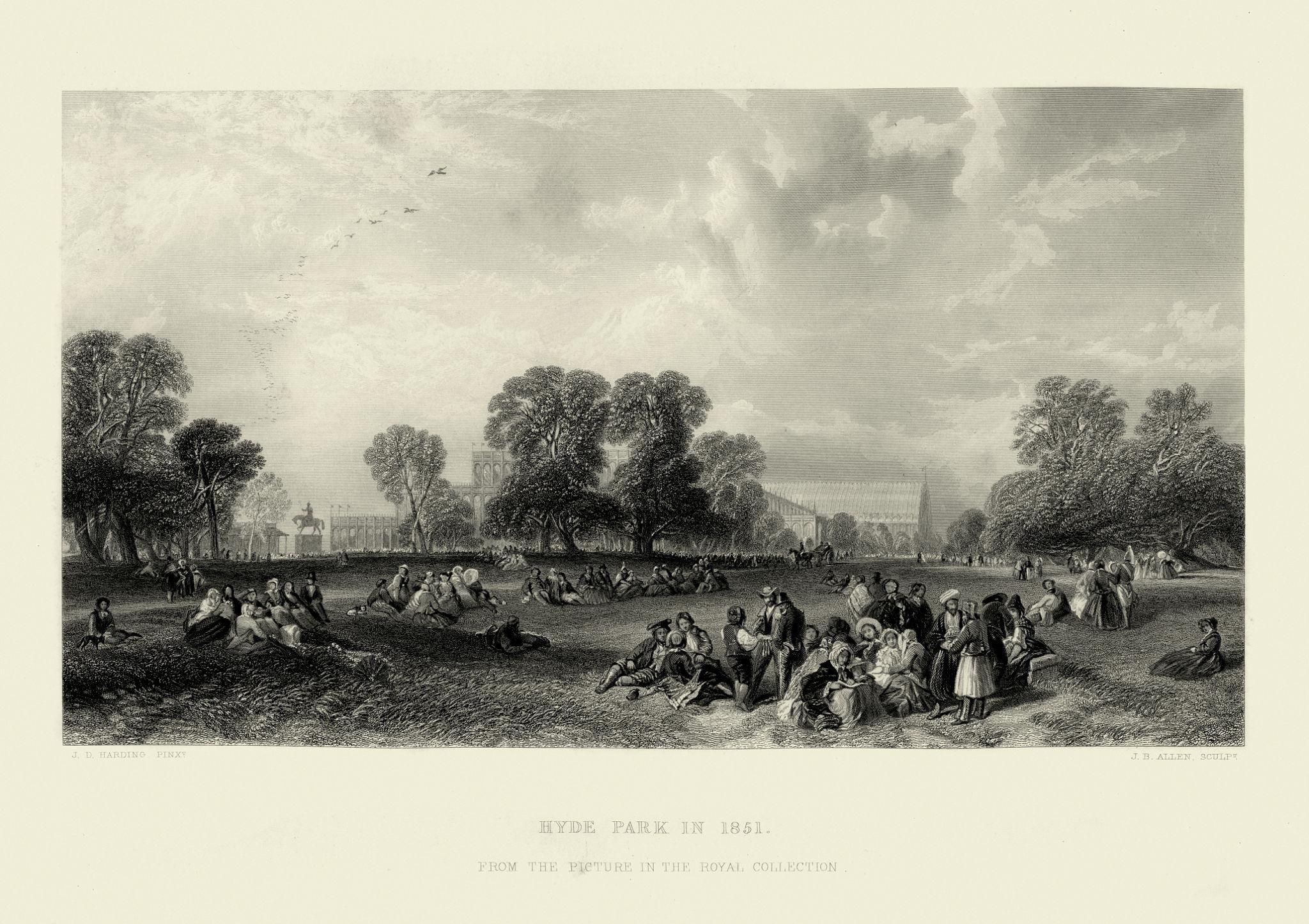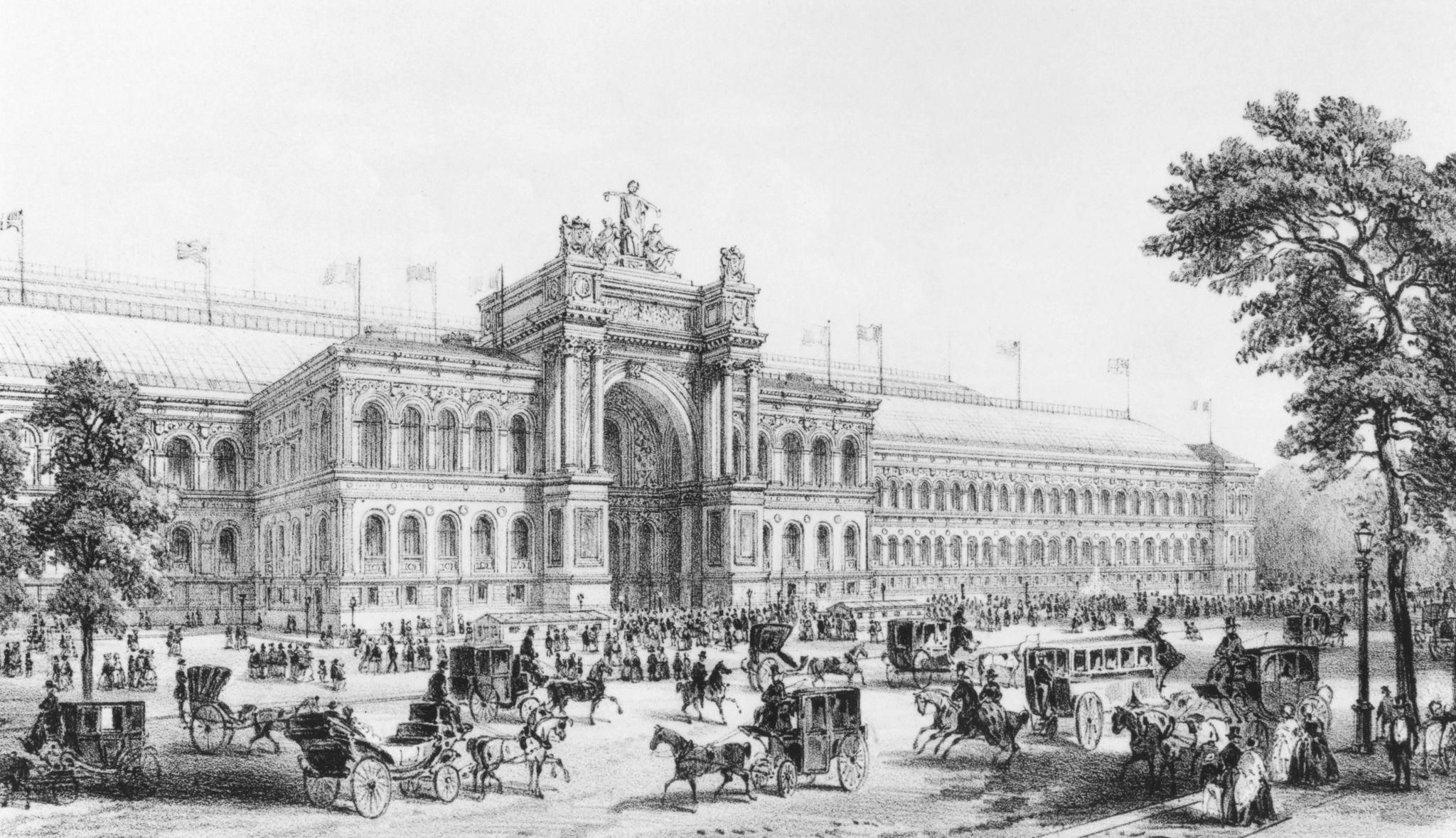 Hyde Park à Londres en 1851, avec le Crystal Palace construit pour la Great Exhibition of the Works of Industry of All Nations, première Exposition universelle consacrée aux progrès de l’industrie, des sciences et des arts.