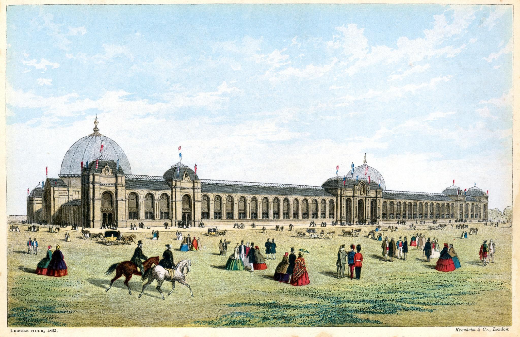 1862. Londres. Le bâtiment de l’International Exhibition de Londres, construit à South Kensington pour accueillir l’Exposition internationale de 1862, consacrée aux progrès de l’industrie, des sciences et des arts.
