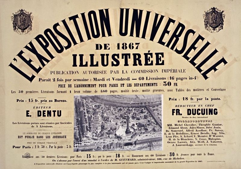 1867. Paris. Affiche annonçant la publication L’Exposition universelle illustrée, consacrée aux pavillons, inventions et événements de l’Exposition universelle organisée sur le Champ-de-Mars. Affiche d’édition, 1867 — domaine public.