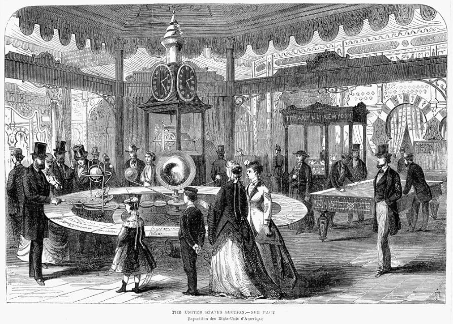 1867. Paris. Section des États-Unis à l’intérieur de l’Exposition universelle, où sont présentées inventions, instruments scientifiques et innovations techniques au public international. Gravure du XIXᵉ siècle — domaine public.