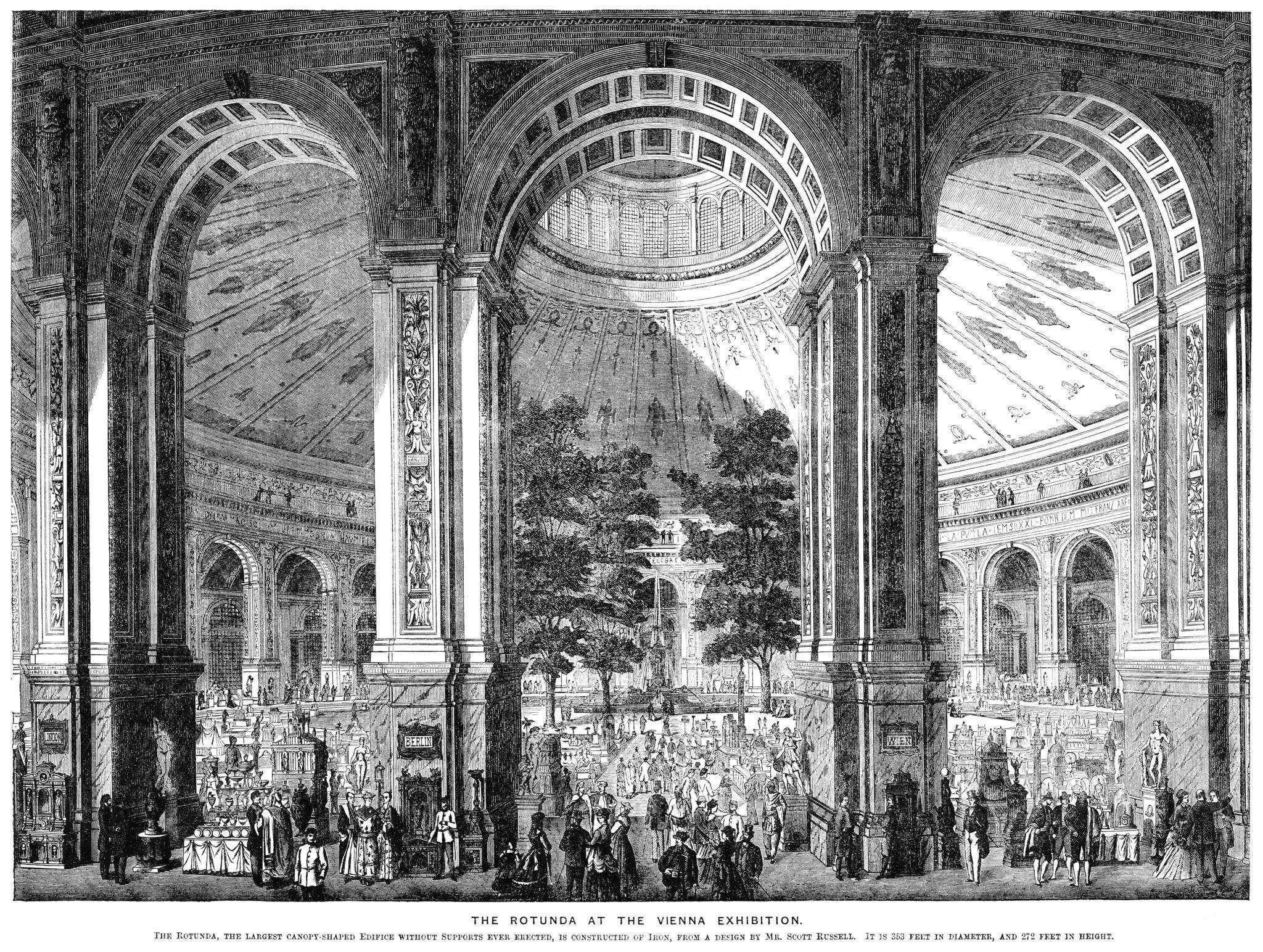 La Rotonde, palais central de la Weltausstellung de Vienne, est l’une des plus grandes coupoles de son époque (84 m de haut et 108 m de diamètre). Après l’exposition, elle accueille de nombreux événements publics — expositions, spectacles, concerts et cirques, avant d’être détruite par un incendie en 1937.