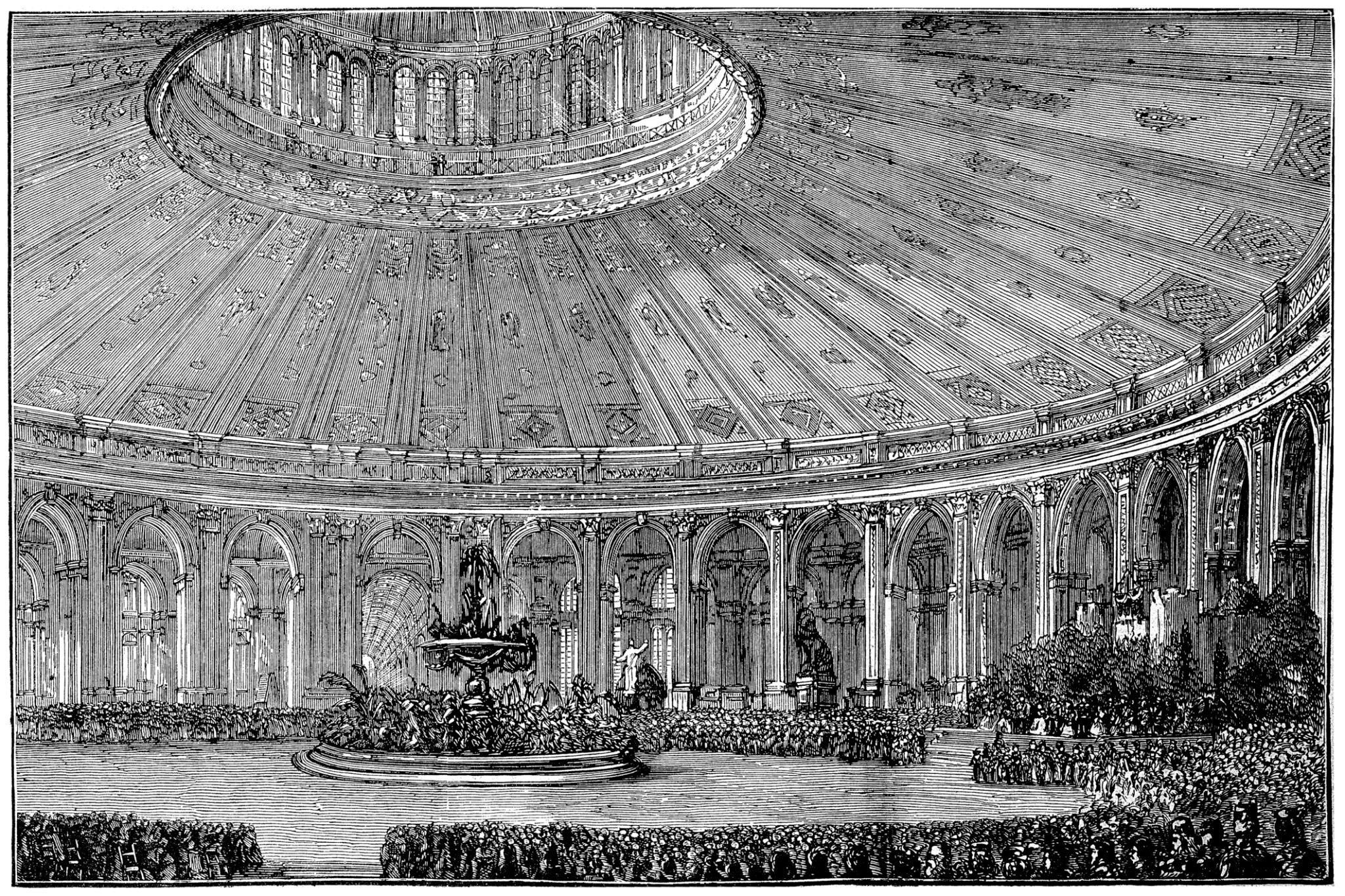 Le bâtiment le plus spectaculaire de l’exposition est la Rotonde, immense construction circulaire dominée par un gigantesque dôme de plus de cent mètres de diamètre. À l’époque, il s’agit de l’une des plus grandes coupoles jamais construites au monde, symbole de la modernité architecturale et technique du milieu du 1800.