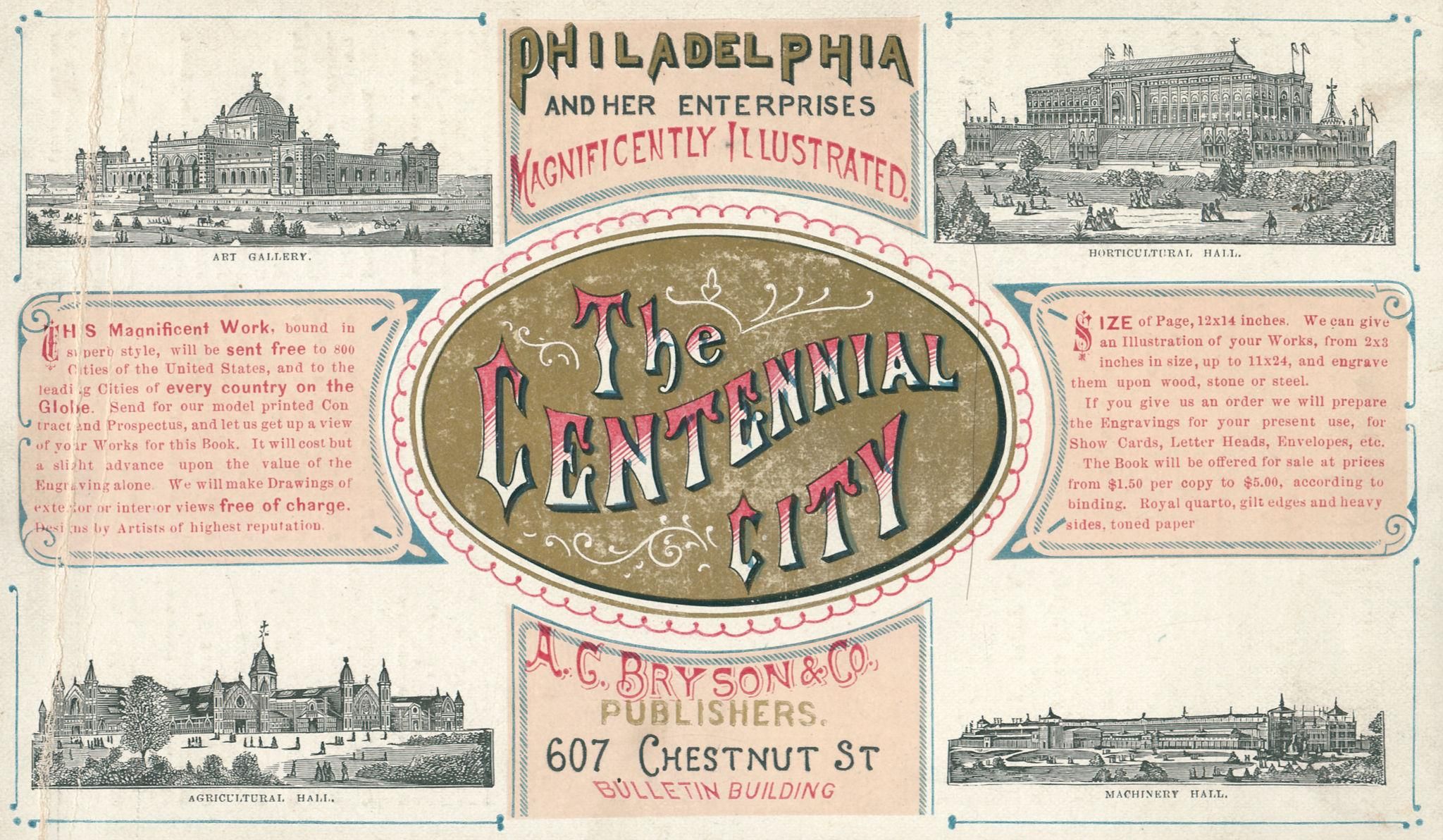 1876. Philadelphie. Affiche publicitaire pour The Centennial City, publication illustrée présentant les principaux bâtiments de l’Exposition universelle de Philadelphie (Centennial Exhibition) organisée en 1876 à Fairmount Park.