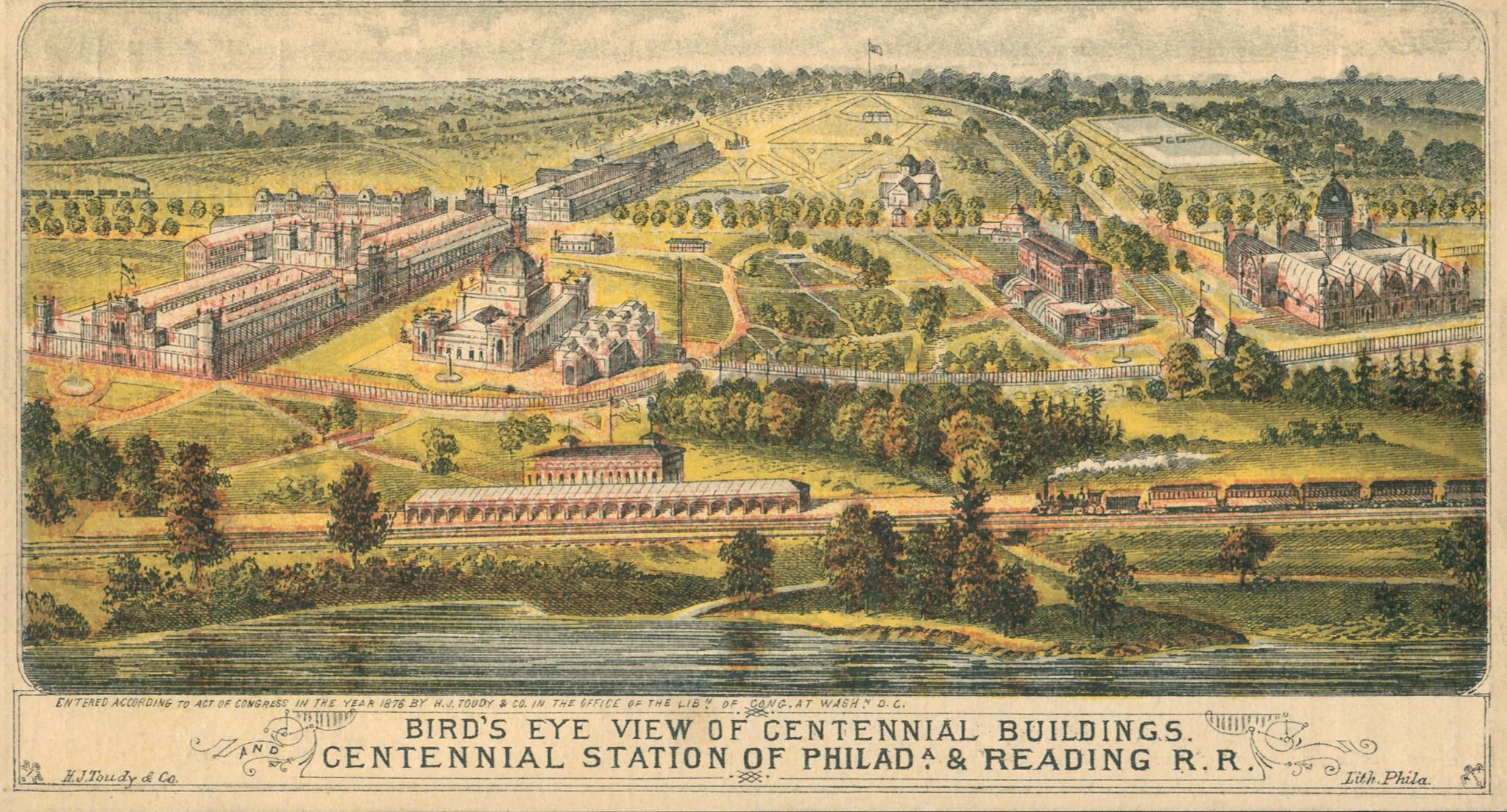 1876. Philadelphie. Vue générale des bâtiments de la Centennial International Exhibition à Fairmount Park, avec les principaux palais et pavillons reliés par la Centennial Station. Lithographie de H. J. Toudy & Co., 1876 — domaine public.