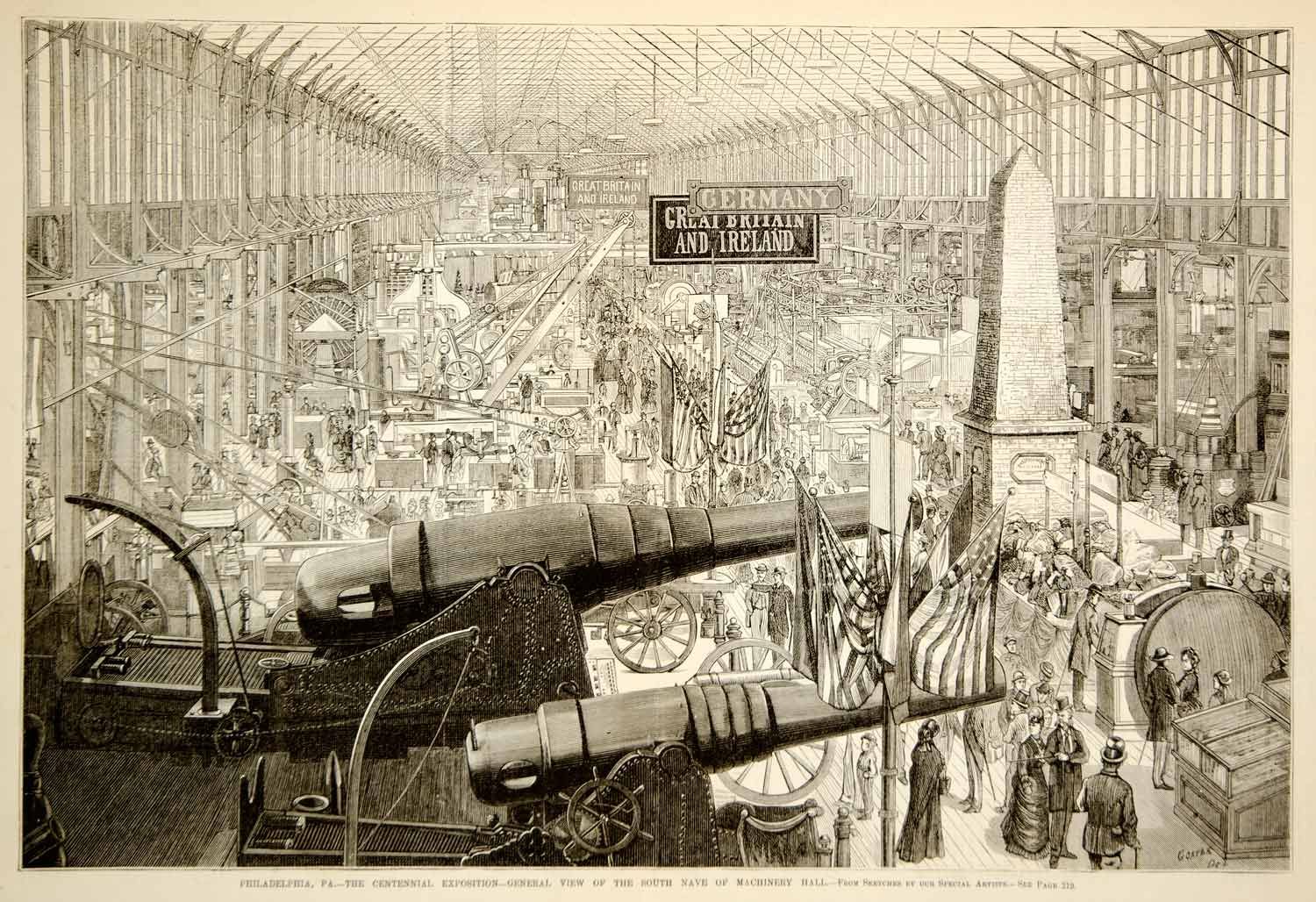 Intérieur du Machinery Hall de la Centennial International Exhibition, immense galerie où les nations présentent machines, inventions et innovations industrielles au public venu célébrer le centenaire des États-Unis.