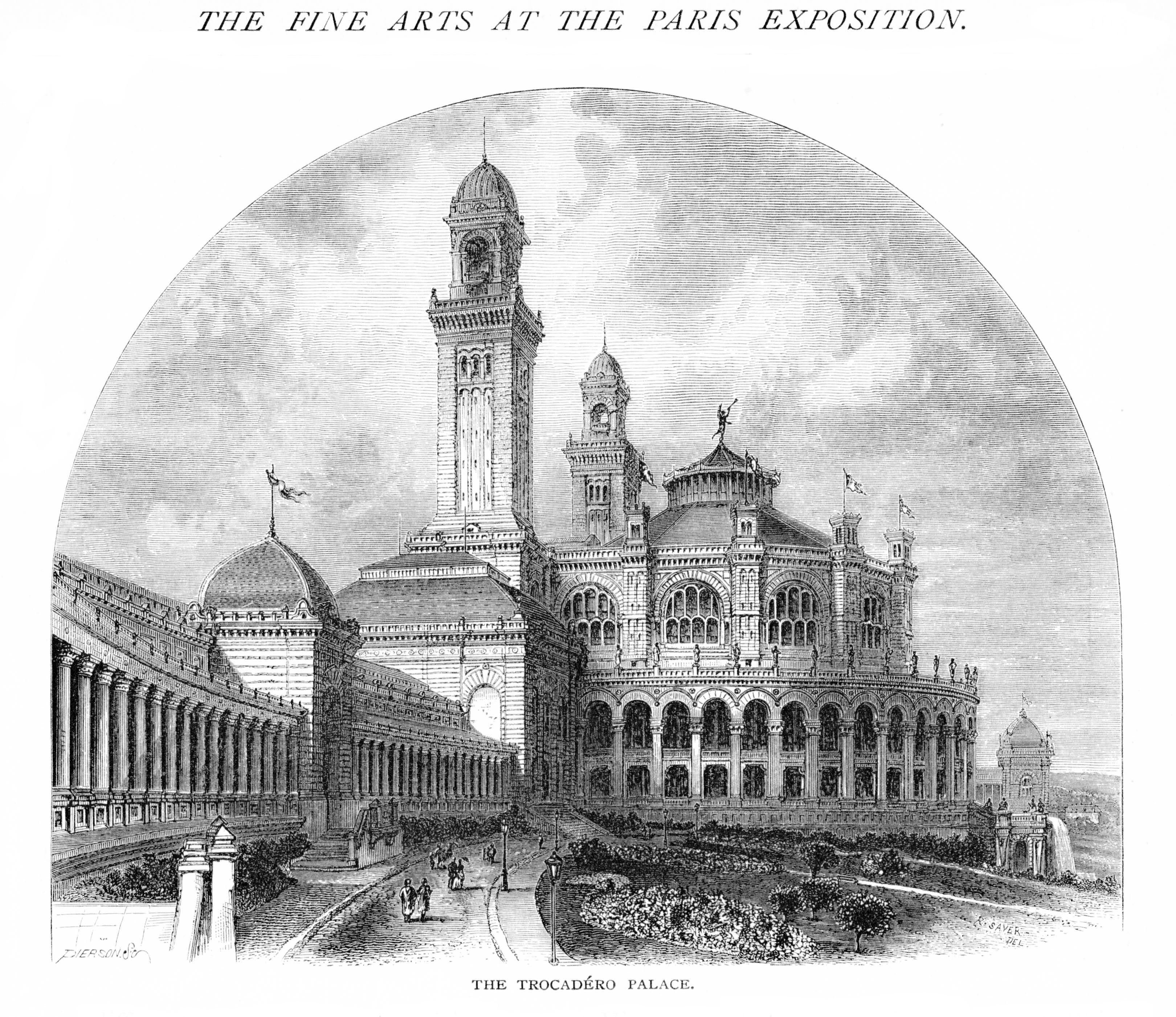 Pour l’occasion, plusieurs bâtiments monumentaux sont construits. Le plus spectaculaire est le Palais du Trocadéro, vaste édifice dominé par deux grandes tours et une salle de spectacle pouvant accueillir plusieurs milliers de personnes. Ce bâtiment devient l’un des symboles de l’exposition et marque durablement le paysage parisien.