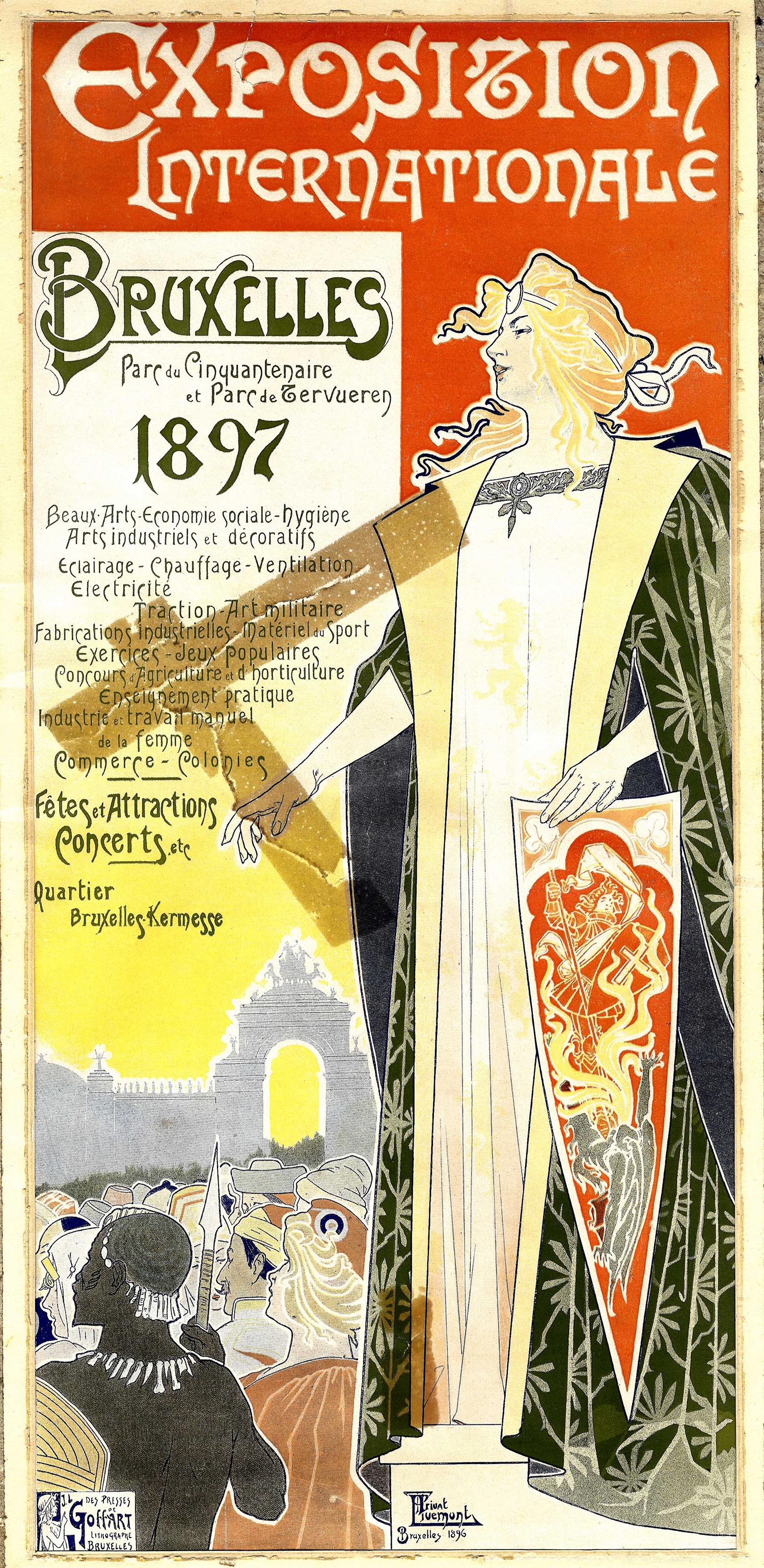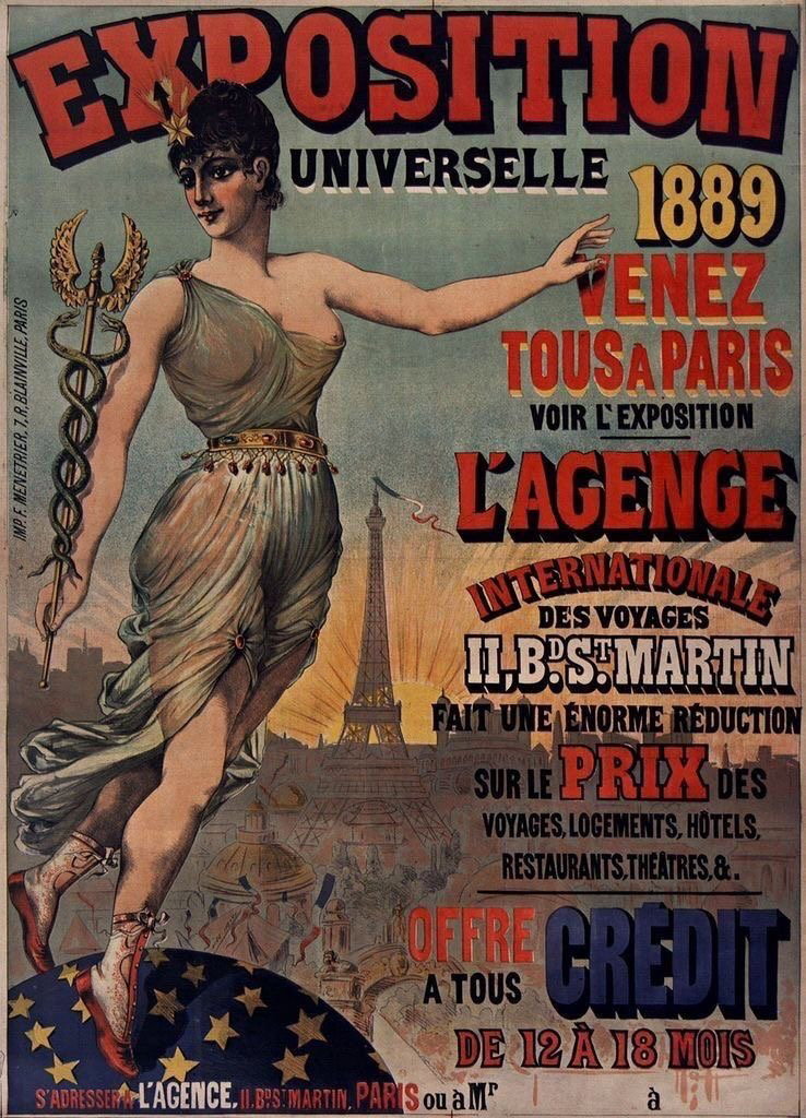 Affiche publicitaire invitant les visiteurs à venir découvrir l’Exposition universelle de Paris, organisée pour célébrer le centenaire de la Révolution française. La silhouette de la tour Eiffel, construite pour l’occasion, domine l’affiche et devient immédiatement l’emblème du progrès et de la modernité. Affiche promotionnelle pour l’Exposition universelle de Paris, 1889 — imprimerie T. Hémery / T. Brunville, Paris — domaine public.