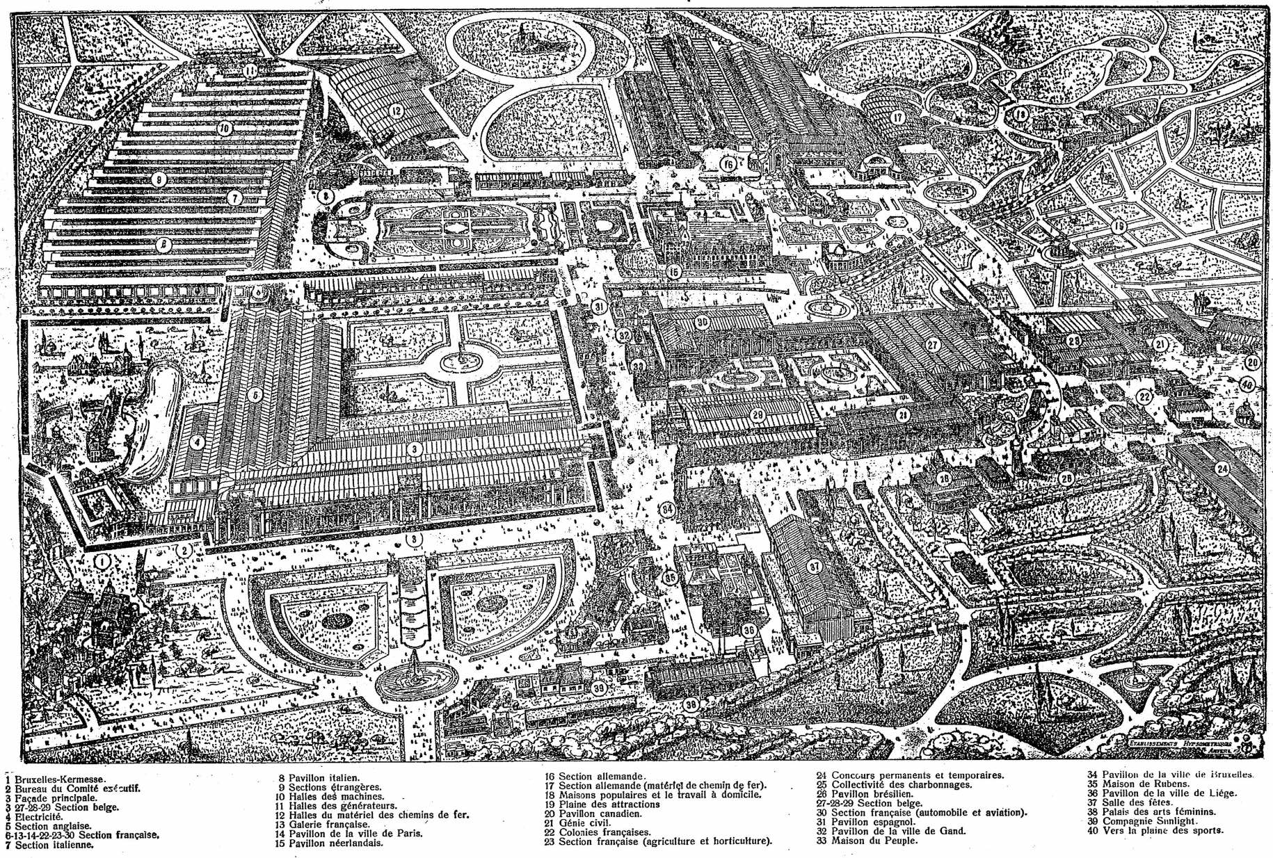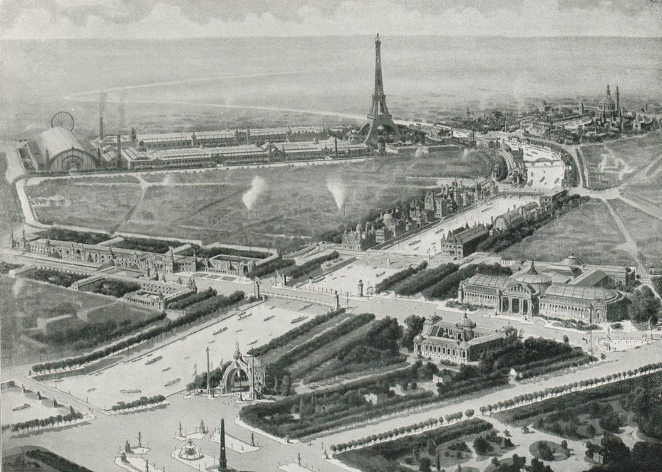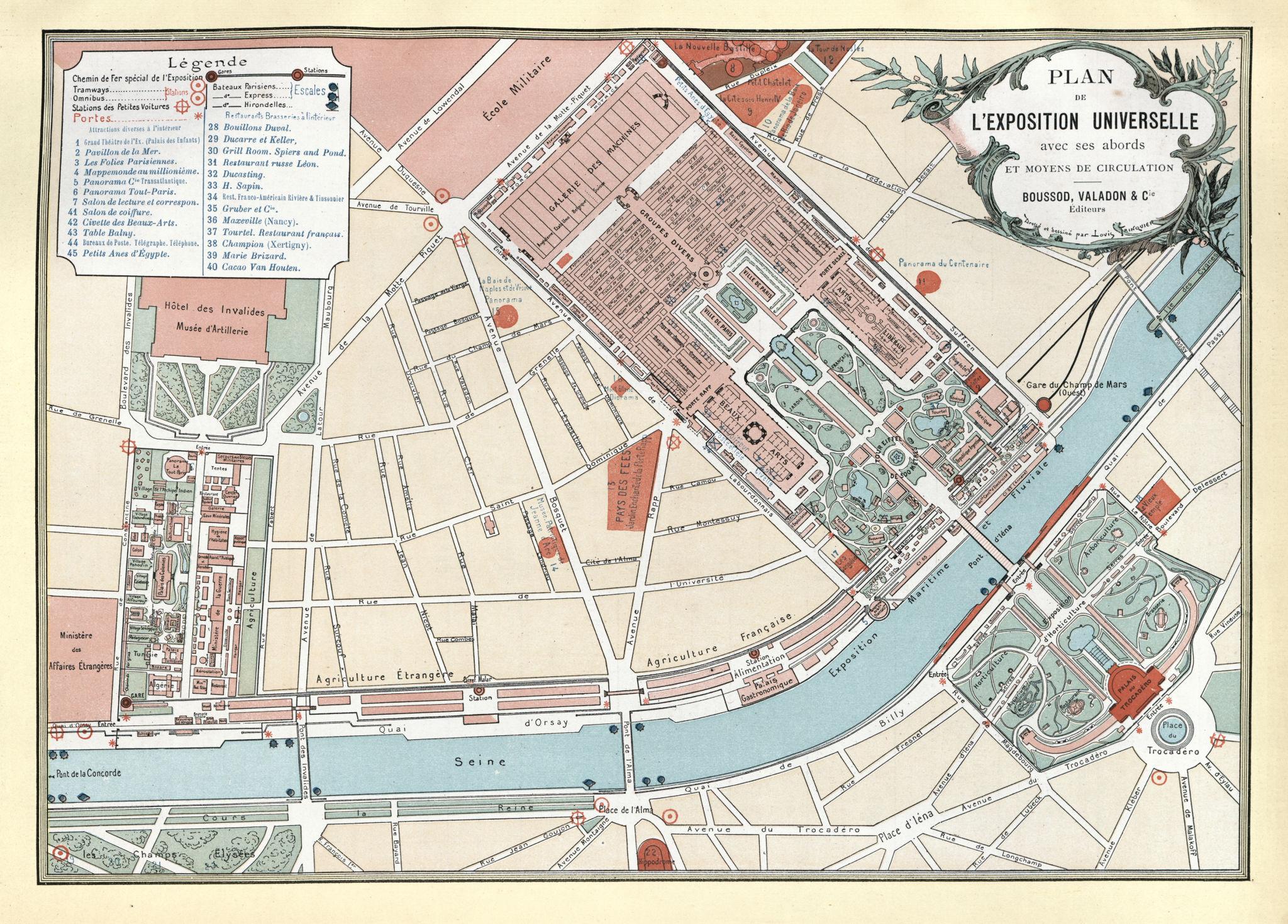 Plan général de l’Exposition universelle de Paris, déployée entre le Champ-de-Mars, la Seine et le Trocadéro. Le site comprend les grands palais d’exposition, la Galerie des Machines, de nombreux pavillons nationaux et la tour Eiffel, édifiée pour l’exposition et devenue son symbole. Plan de l’Exposition universelle de Paris, 1889 — Boussod, Valadon & Cie, éditeurs — domaine public.