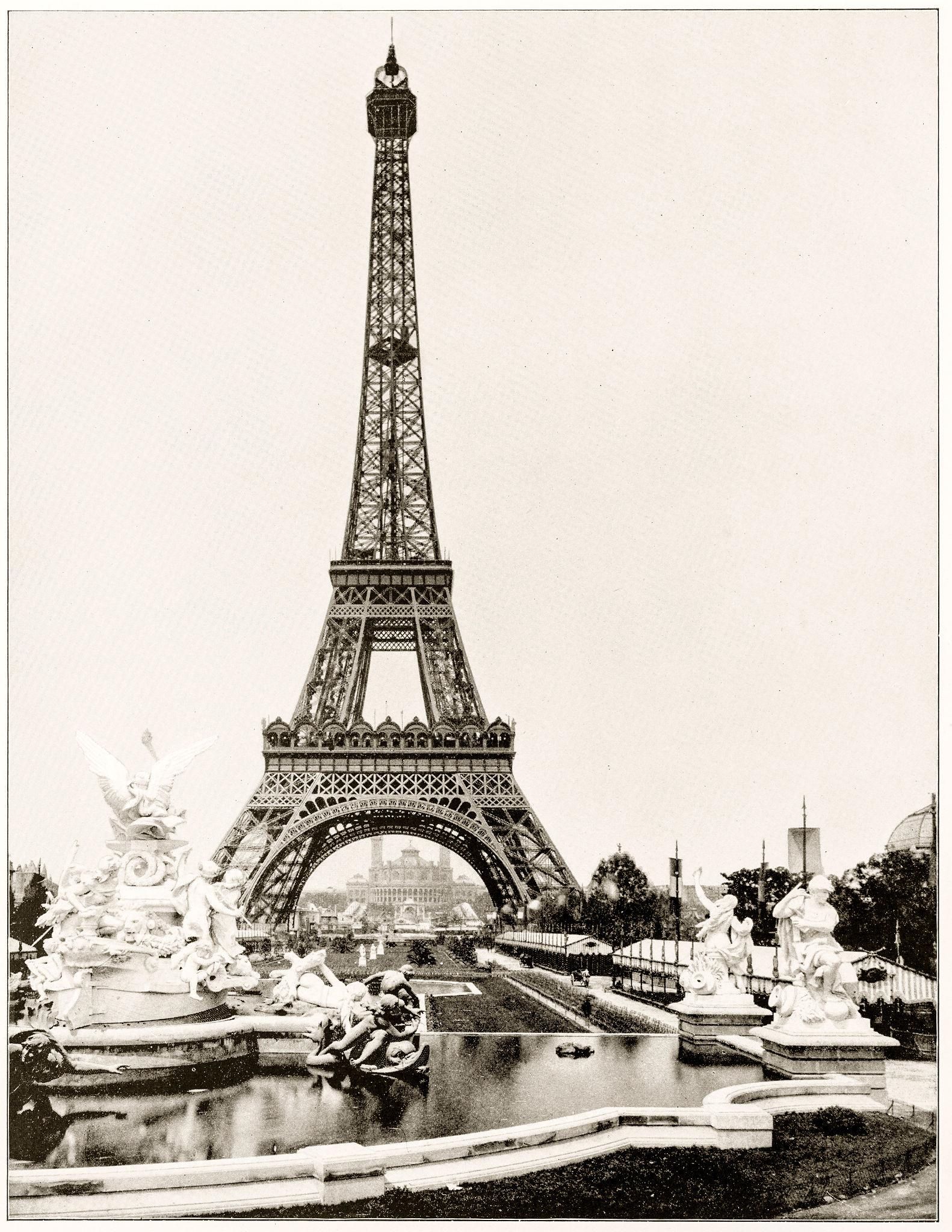 La tour Eiffel, construite pour l’Exposition universelle de Paris de 1889 sur le Champ-de-Mars, haute de 300 mètres et devenue l’un des monuments les plus célèbres du monde.