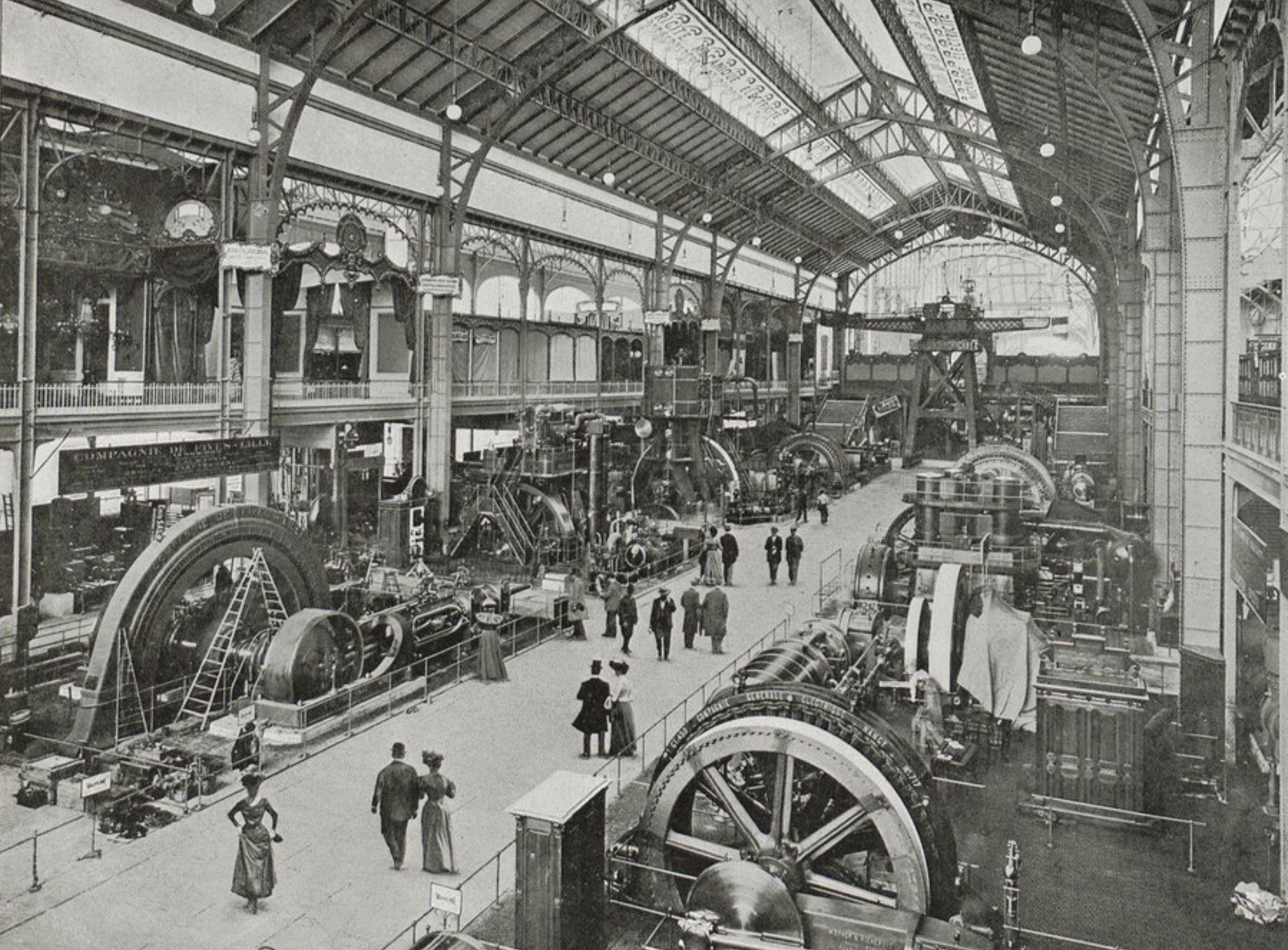 Les galeries d’exposition installées sur le Champ-de-Mars présentent machines industrielles, innovations techniques, instruments scientifiques, produits manufacturés, objets artisanaux et œuvres d’art venus du monde entier. L’exposition met également en valeur les progrès de l’électricité, de la mécanique et des transports.