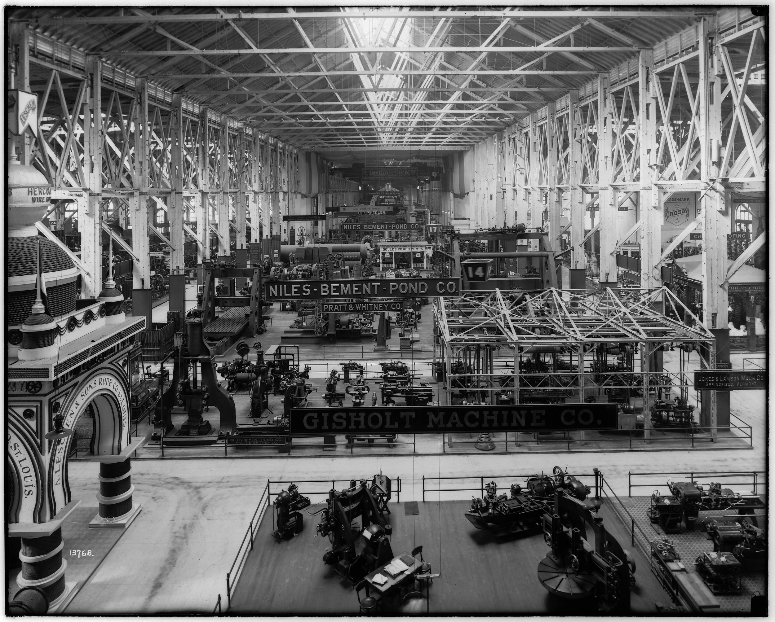Plusieurs bâtiments monumentaux sont construits pour l’occasion. Parmi les plus impressionnants figure le Machinery Hall, gigantesque hall consacré aux machines industrielles, où fonctionne notamment le spectaculaire Corliss Steam Engine, immense machine à vapeur qui attire l’attention des visiteurs. Le Memorial Hall, dédié aux beaux-arts, demeure aujourd’hui l’un des rares bâtiments encore conservés de l’exposition.