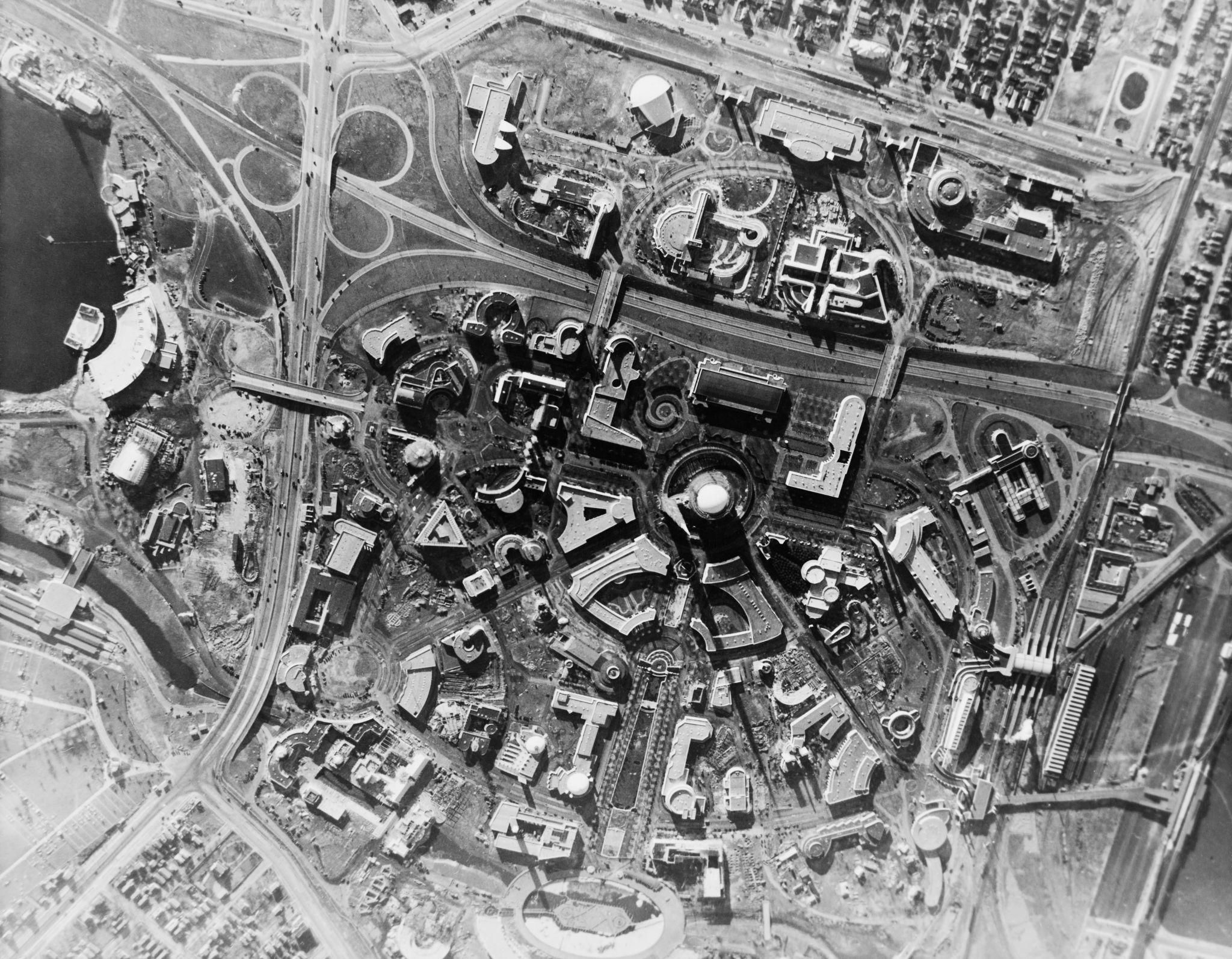 Vue générale de l’Exposition universelle de Montréal (Expo 67), organisée sur les îles Sainte-Hélène et Notre-Dame dans le fleuve Saint-Laurent, où les pavillons nationaux et les architectures futuristes accueillaient des millions de visiteurs venus du monde entier.