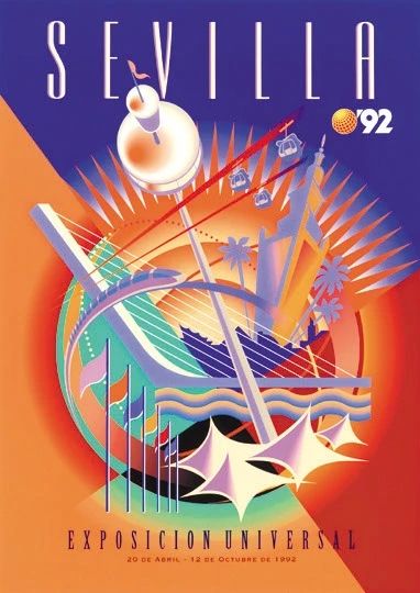 Affiche officielle de l’Exposition universelle de Séville (Expo ’92), organisée en Espagne du 20 avril au 12 octobre 1992 pour commémorer les 500 ans du voyage de Christophe Colomb et les échanges entre les continents.