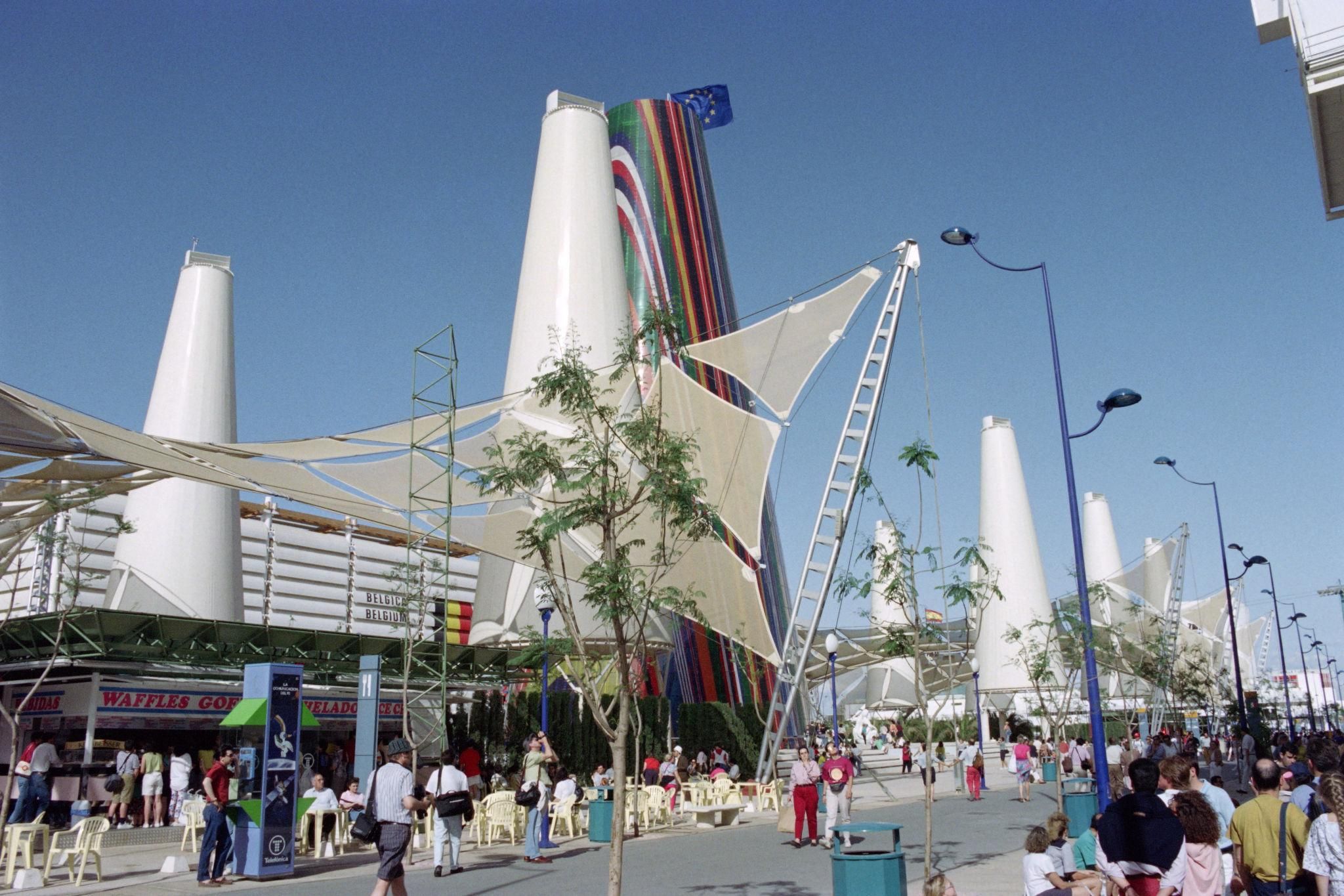 Vue d’un secteur de l’Exposition universelle de Séville (Expo ’92), où les pavillons nationaux et les grandes structures architecturales contemporaines accueillaient les visiteurs venus découvrir les innovations et cultures du monde entier.