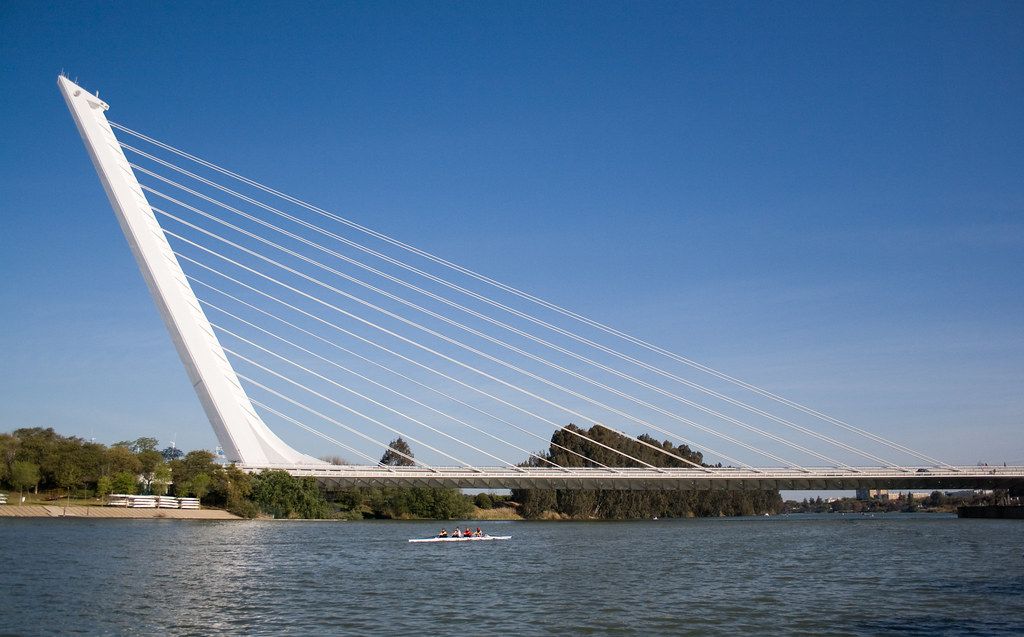 Le pont de l’Alamillo à Séville, conçu par Santiago Calatrava pour l’Exposition universelle de 1992, reliant la ville à l’île de la Cartuja où se déroulait l’exposition.