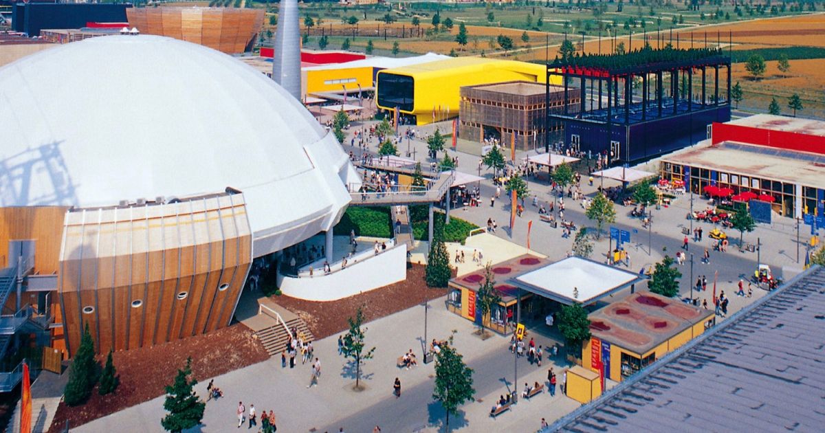 Vue d’un secteur de l’Exposition universelle de Hanovre (Expo 2000), où les pavillons contemporains et les espaces d’exposition illustraient les relations entre l’homme, la nature et la technologie.