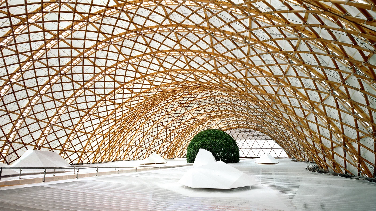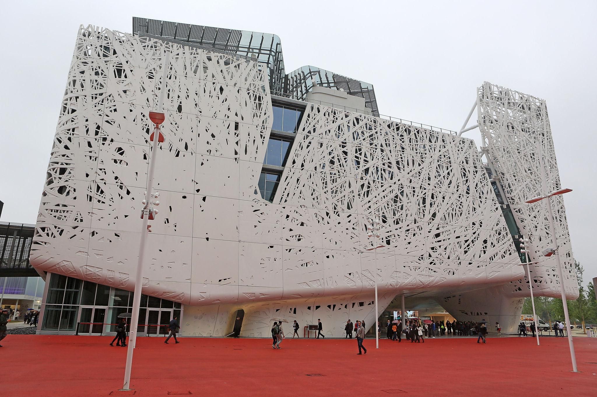 Pavillon italien à l’Exposition universelle de Milan (Expo 2015), remarquable par sa façade blanche ajourée inspirée d’un entrelacs de branches, symbole d’une architecture durable et d’une ville tournée vers l’avenir.