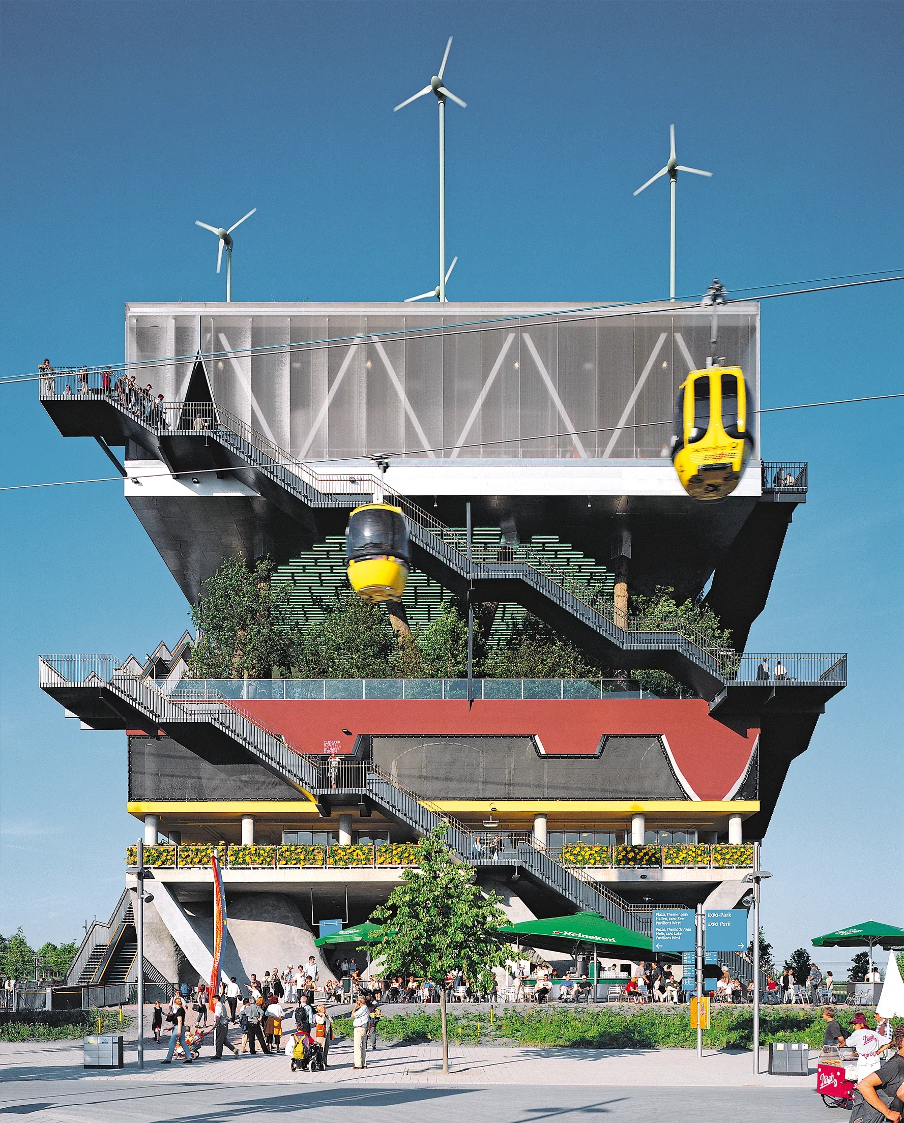 Le pavillon des Pays-Bas à l’Exposition universelle de Hanovre (Expo 2000), architecture expérimentale imaginée comme un paysage vertical superposant différents environnements naturels.