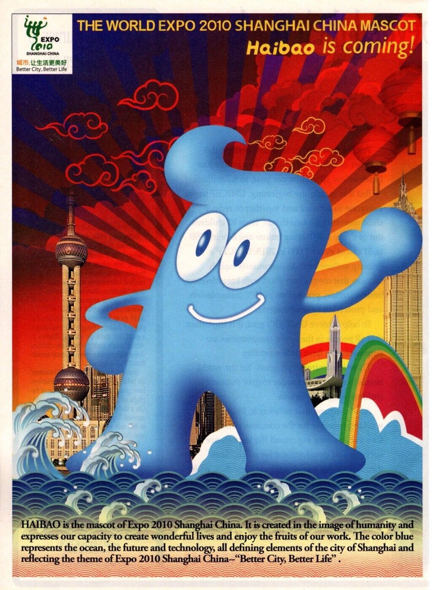 Affiche promotionnelle de l’Exposition universelle de Shanghai (Expo 2010) présentant la mascotte officielle “Haibao”, symbole de l’événement organisé en Chine du 1ᵉʳ mai au 31 octobre 2010 sous le thème « Better City, Better Life »