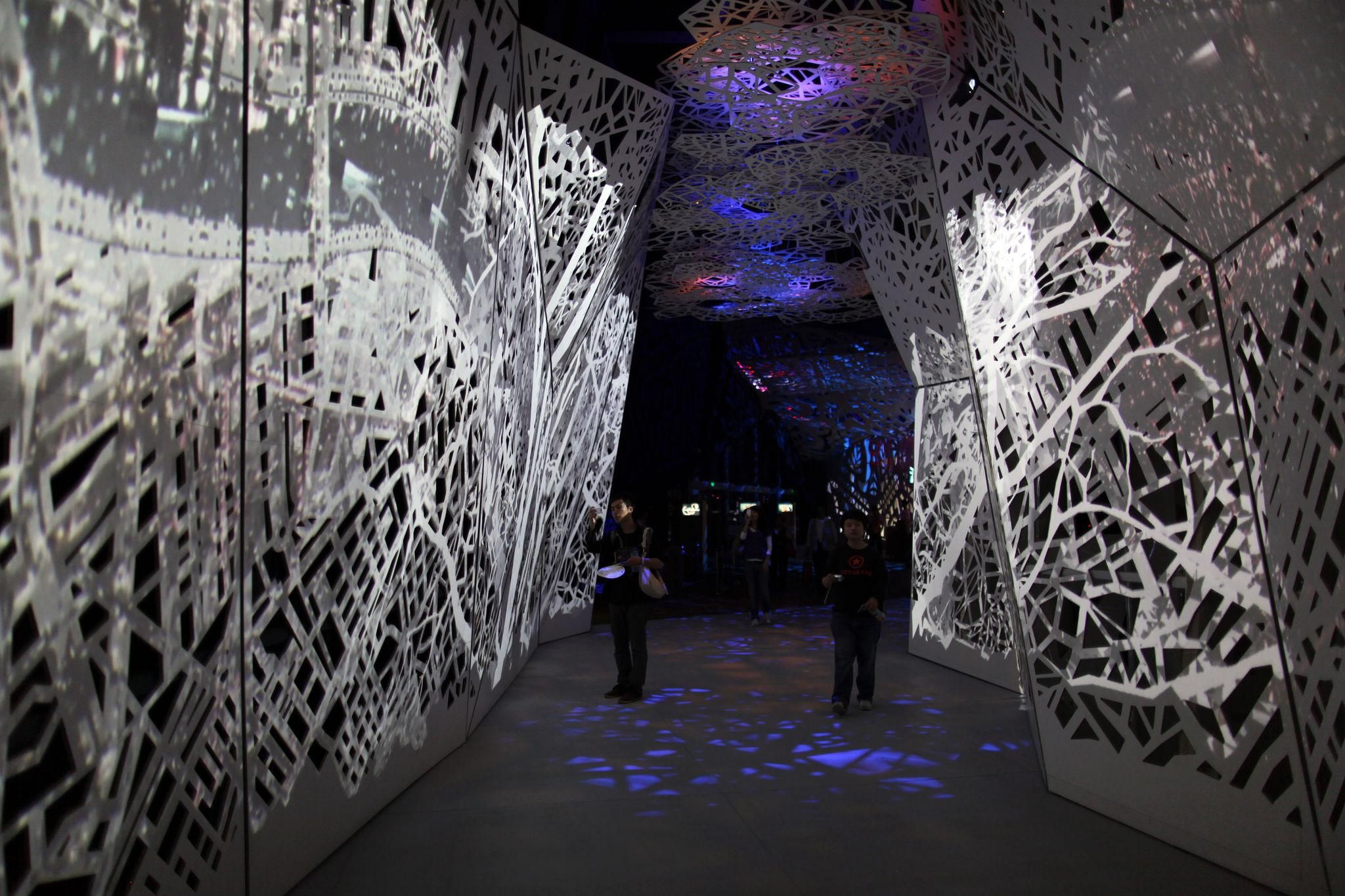 Intérieur d’un pavillon de l’Exposition universelle de Shanghai (Expo 2010), où les installations immersives et les dispositifs multimédias mettaient en scène les villes du futur et les innovations urbaines.