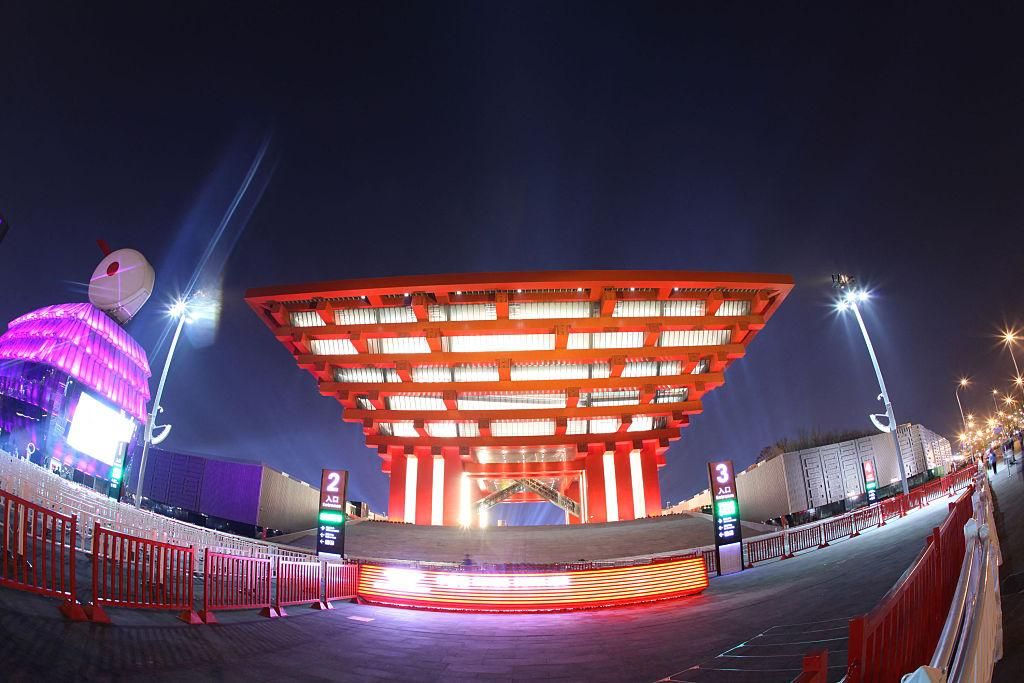 Le pavillon de la Chine à l’Exposition universelle de Shanghai de 2010, structure monumentale rouge inspirée de l’architecture traditionnelle chinoise.