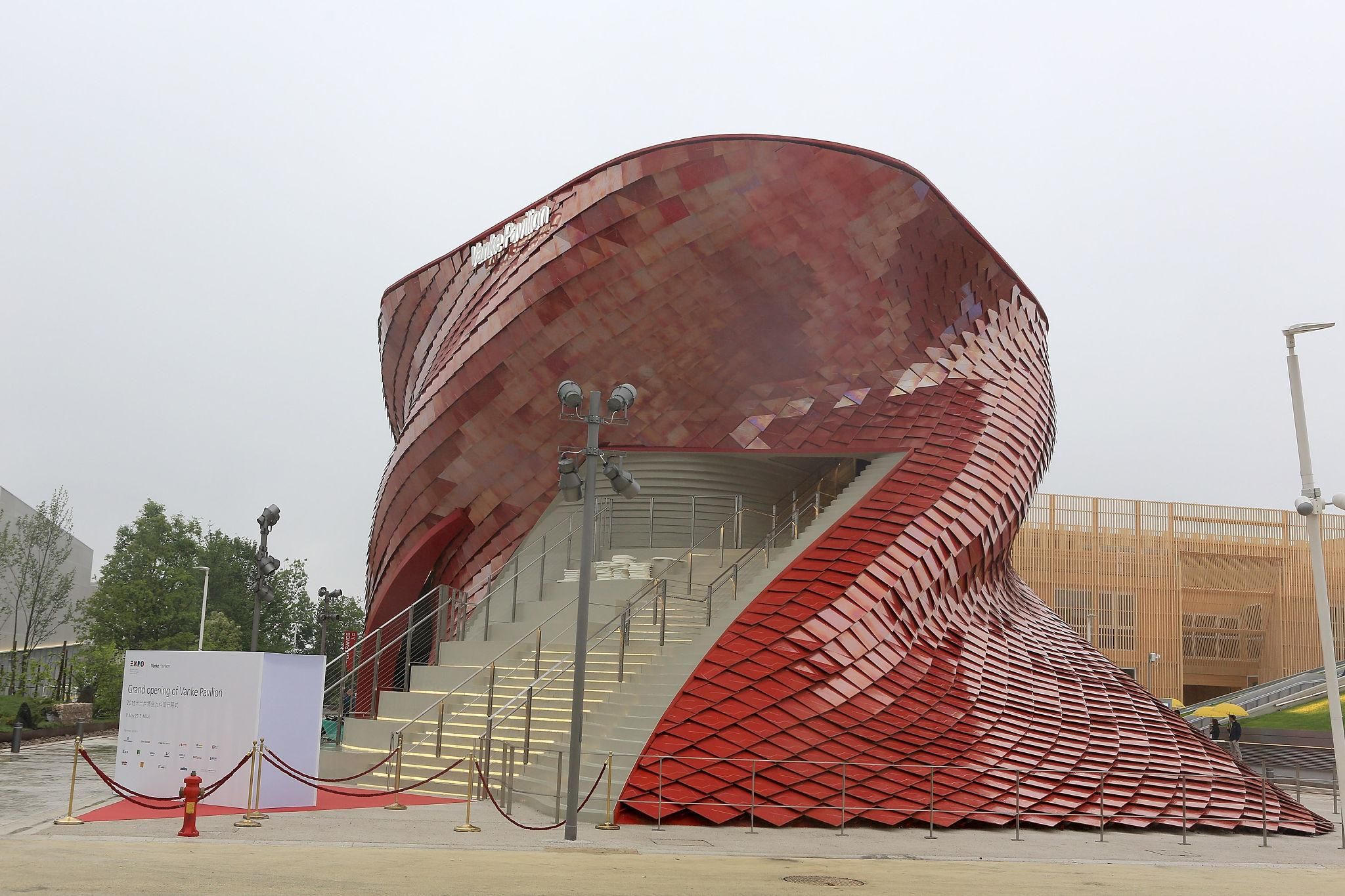 Pavillon Vanke à l’Exposition universelle de Milan (Expo 2015), réalisé par le groupe immobilier chinois Vanke, remarquable par son architecture recouverte de milliers de tuiles rouges évoquant les écailles d’un dragon.