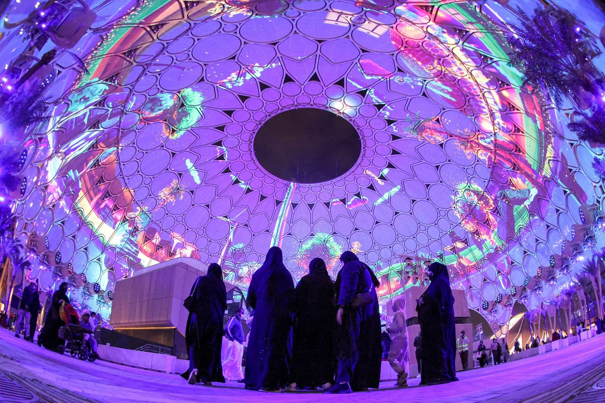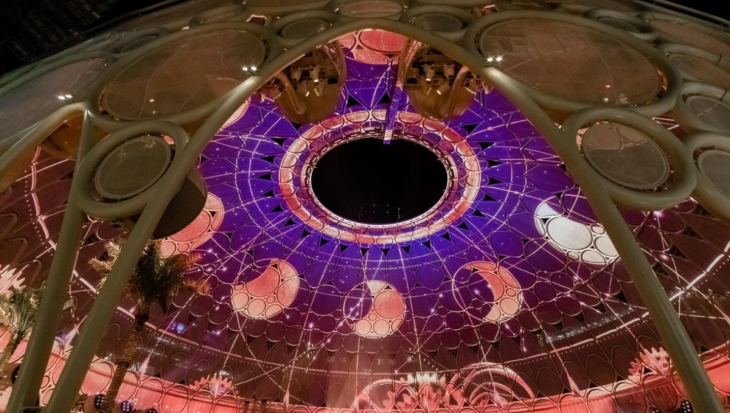Al Wasl Plaza à l’Exposition universelle de Dubaï (Expo 2020), immense coupole servant d’écran de projection à 360°, cœur spectaculaire du site où se déroulent cérémonies, spectacles et installations lumineuses.