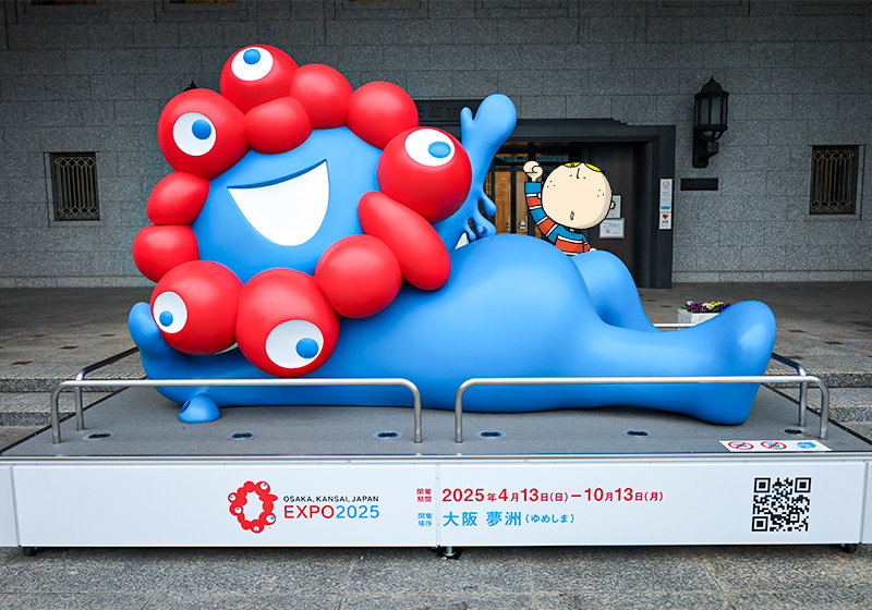 Mascotte officielle de l’Exposition universelle d’Osaka 2025, “Myaku-Myaku”, personnage bleu entouré d’anneaux rouges symbolisant la circulation de la vie et de l’eau, devenu l’un des emblèmes visuels de l’Expo.