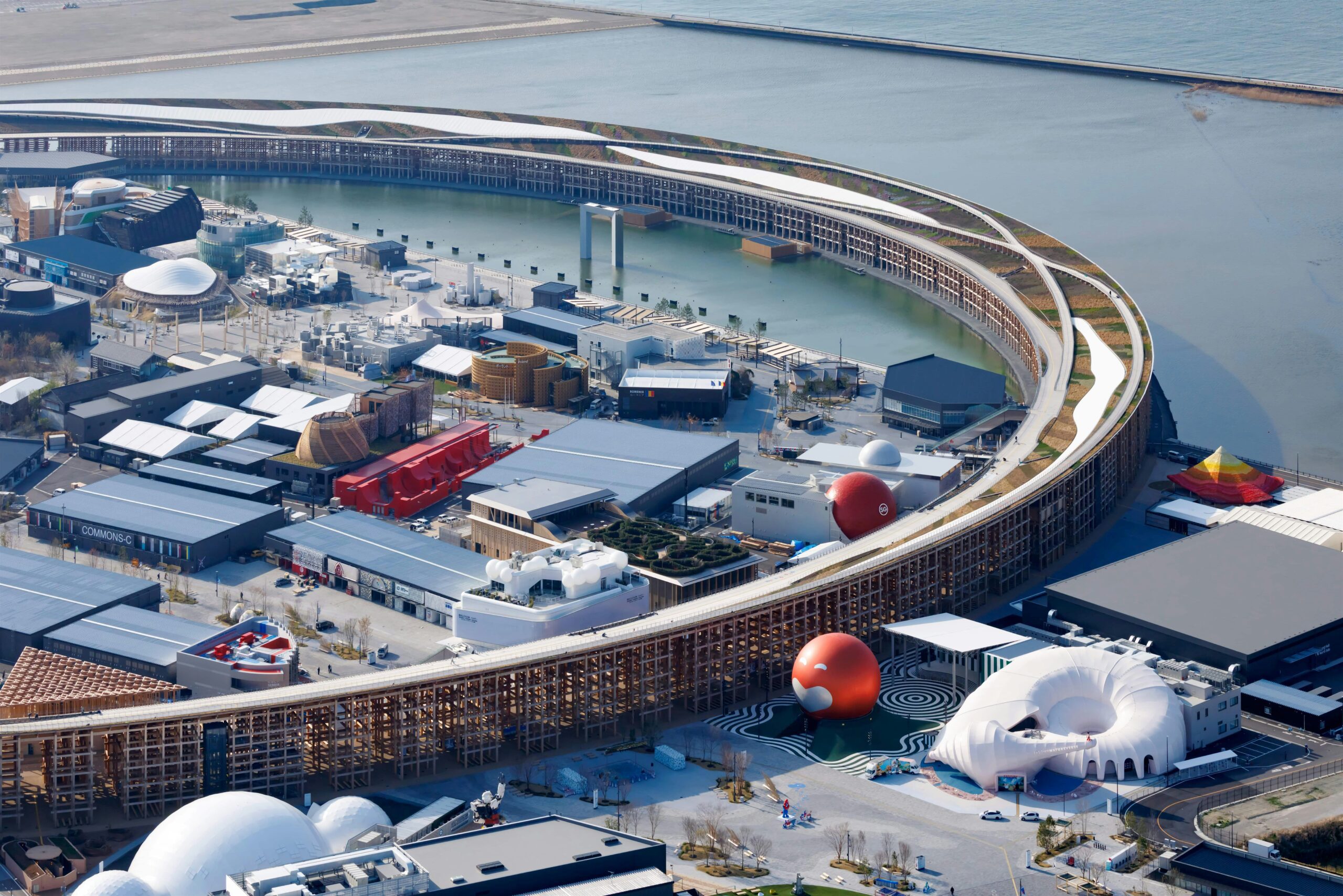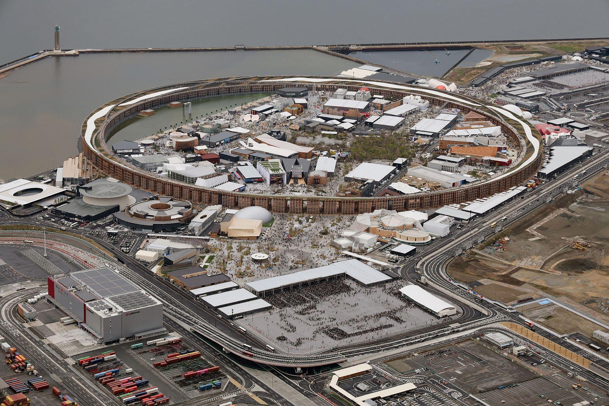 Vue aérienne du site de l’Exposition universelle d’Osaka 2025 sur l’île artificielle de Yumeshima, organisé autour du “Grand Ring”, immense structure circulaire en bois qui relie les pavillons des différents pays participants.